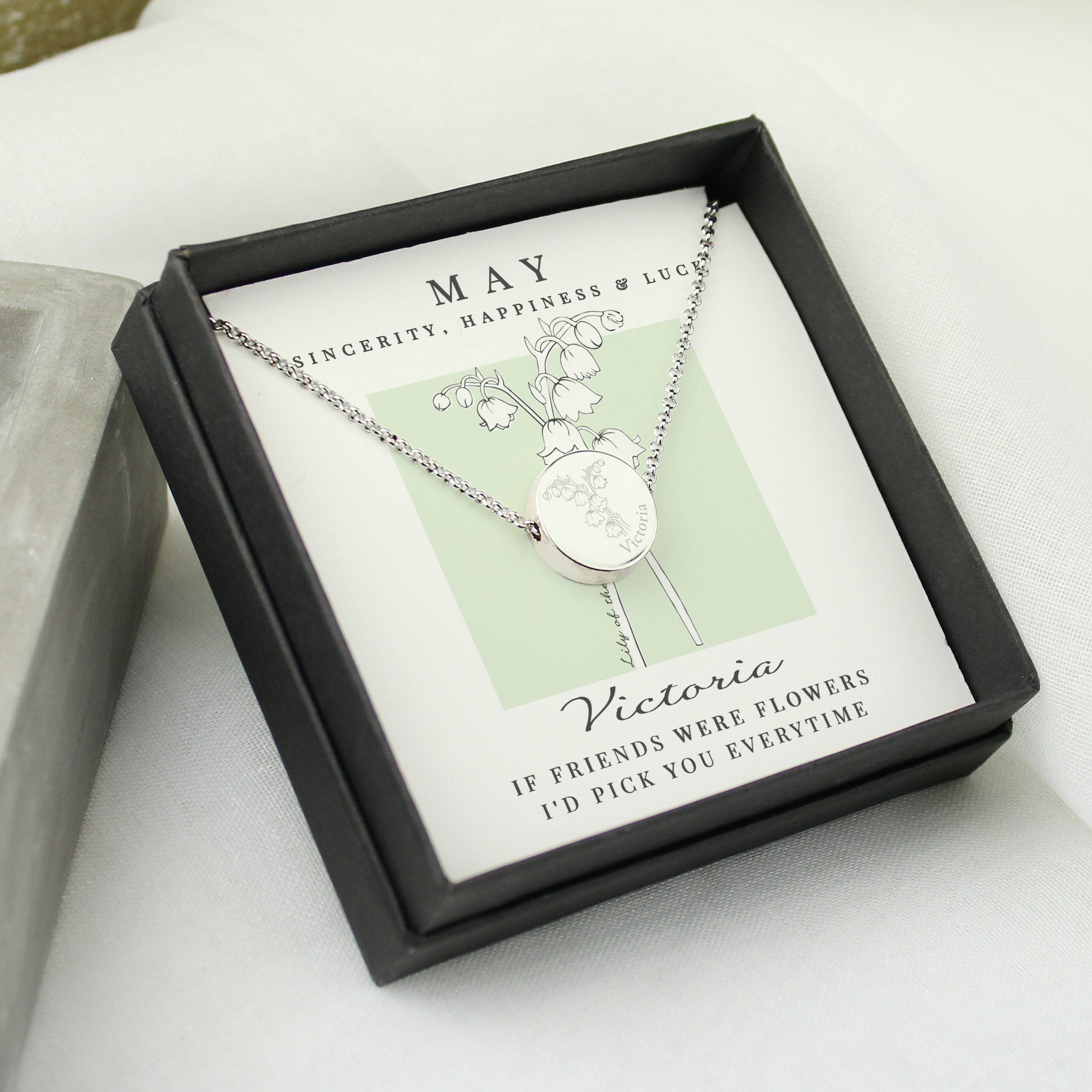 Featuring a colourful lily of the valley illustration and the fixed text 'MAY - SINCERITY, HAPPINESS & LUCK', you can make this gift extra special by adding a personal message as below