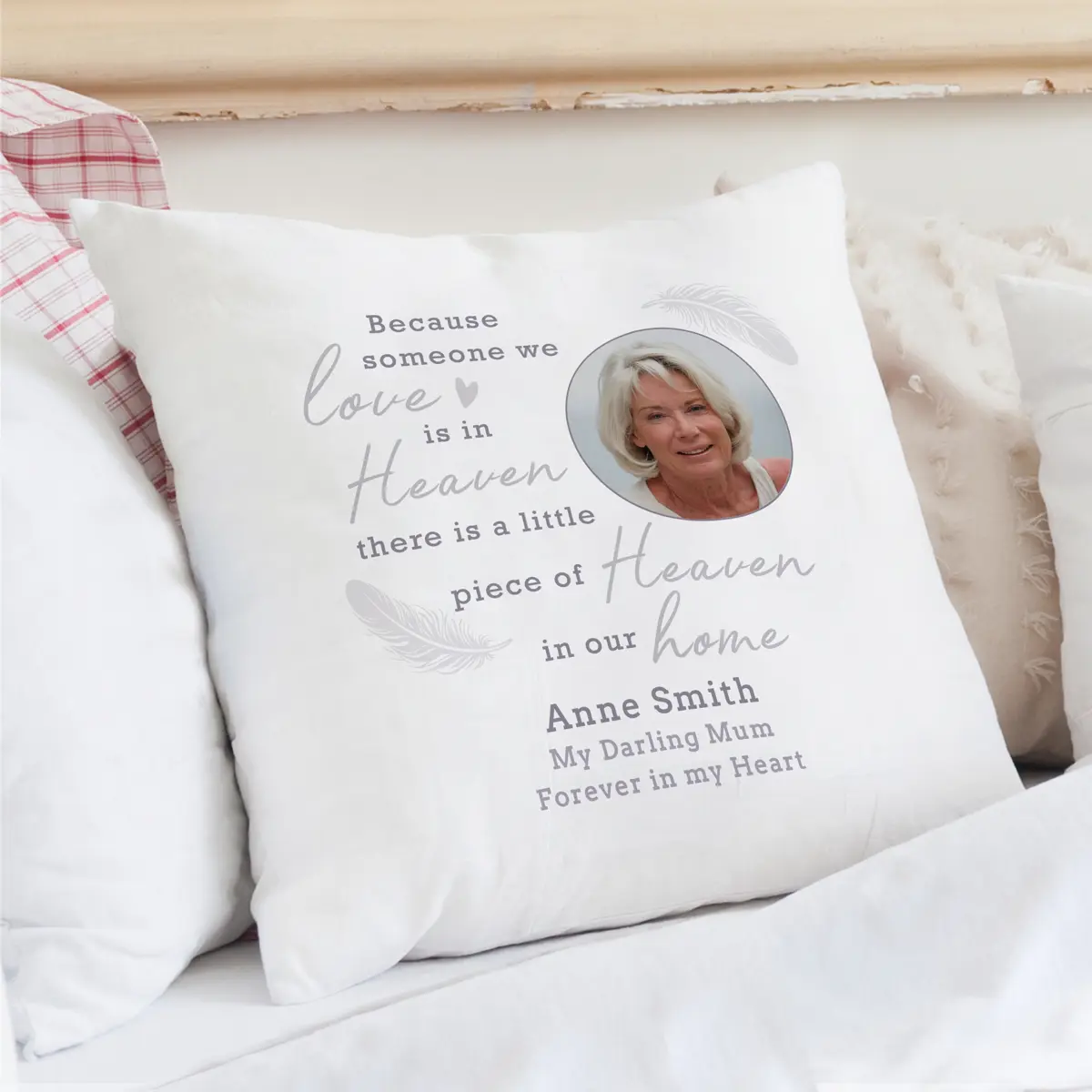 Capture your loved ones memory with this photo upload memorial cushion. Personalise with your chosen photo which is surrounded by the fixed text 'Because someone we love in Heaven, there is a little piece of Heaven is in our home""