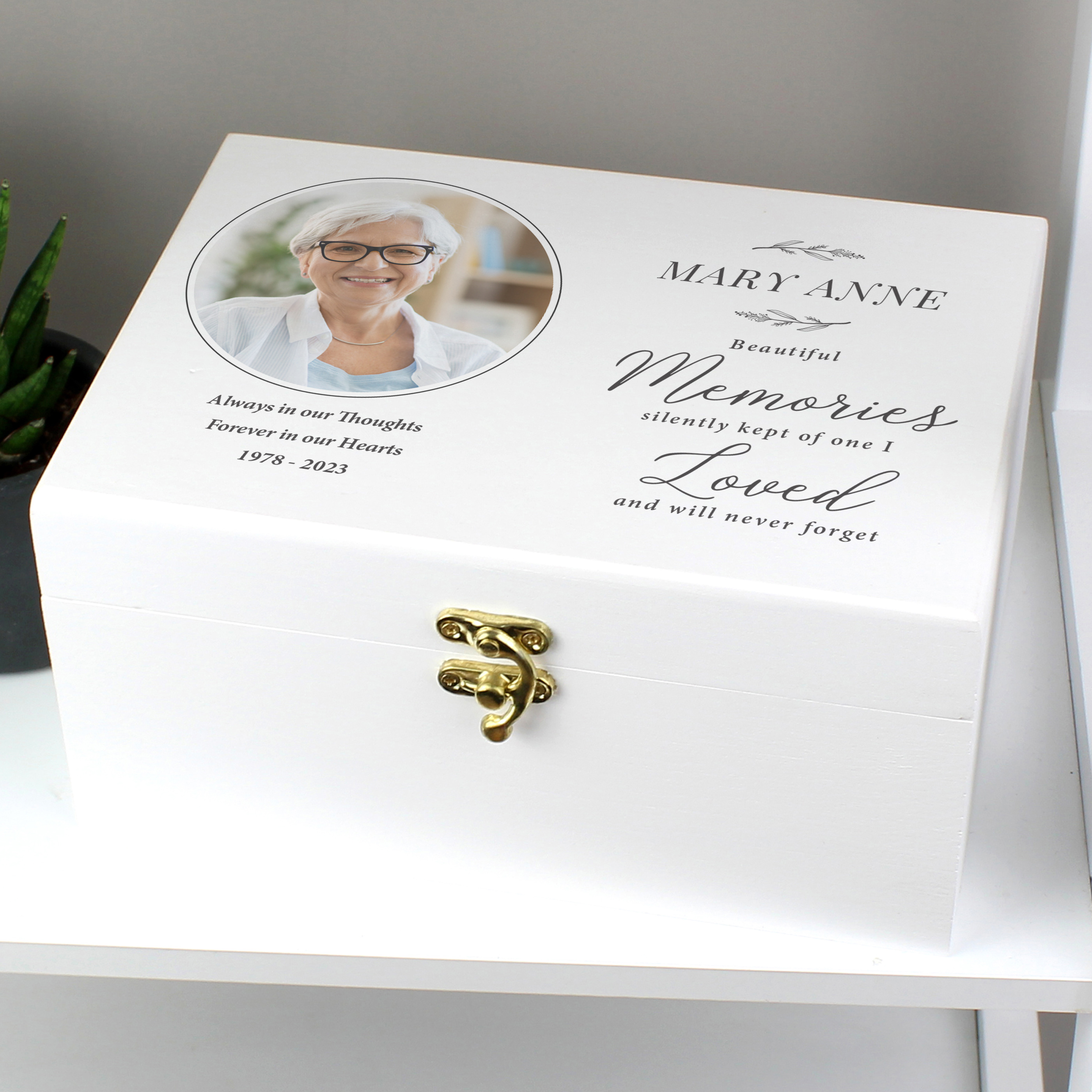 Our Personalised Memorial Photo Upload White Wooden Keepsake Box is perfect for storing precious memories of your loved one.