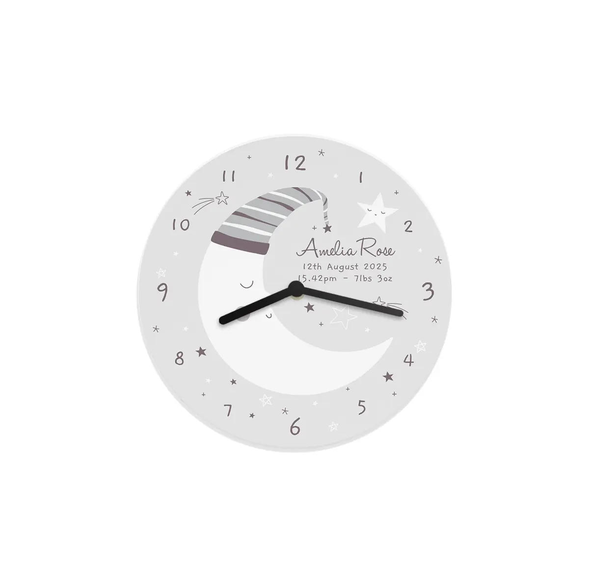 Our Personalised Moon Wooden Nursery Clock is a charming and meaningful addition to any child's nursery or bedroom.