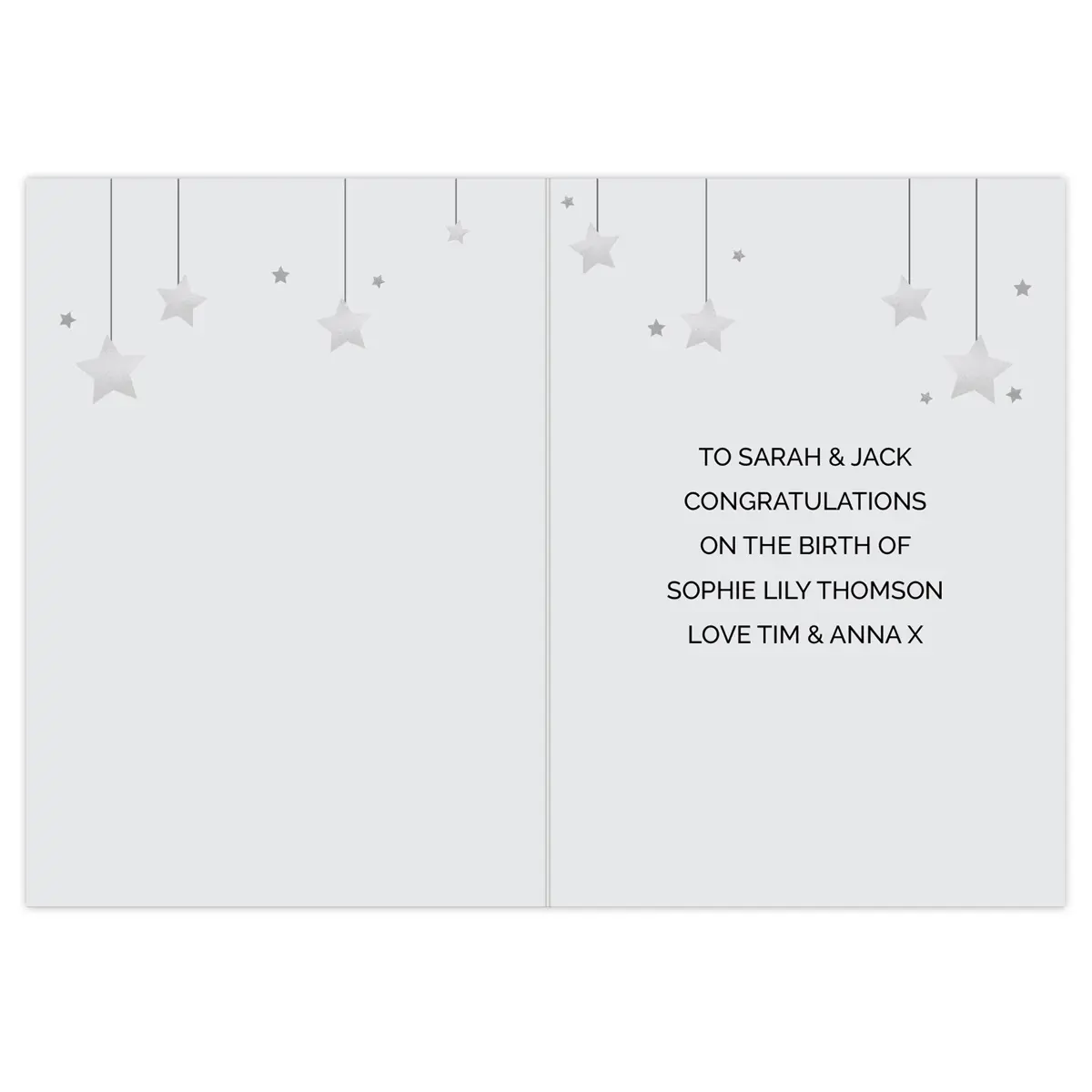 • Personalise the front with time (5 characters), AM or PM (5 characters), two names up to 12 characters each, date up to 20 characters, and weight details on two stars (up to 4 characters each)