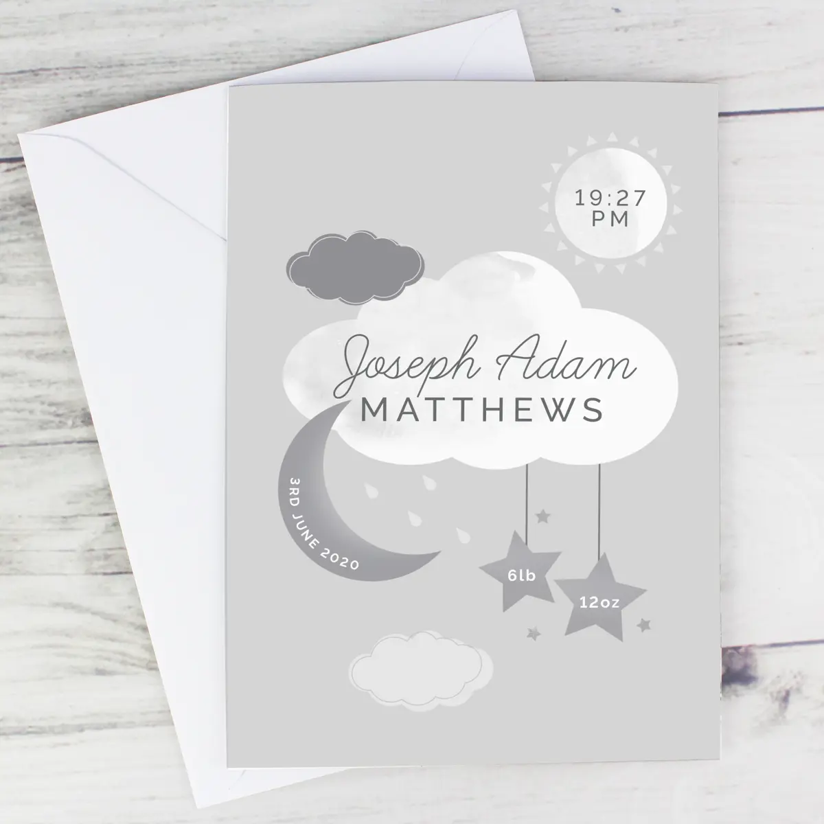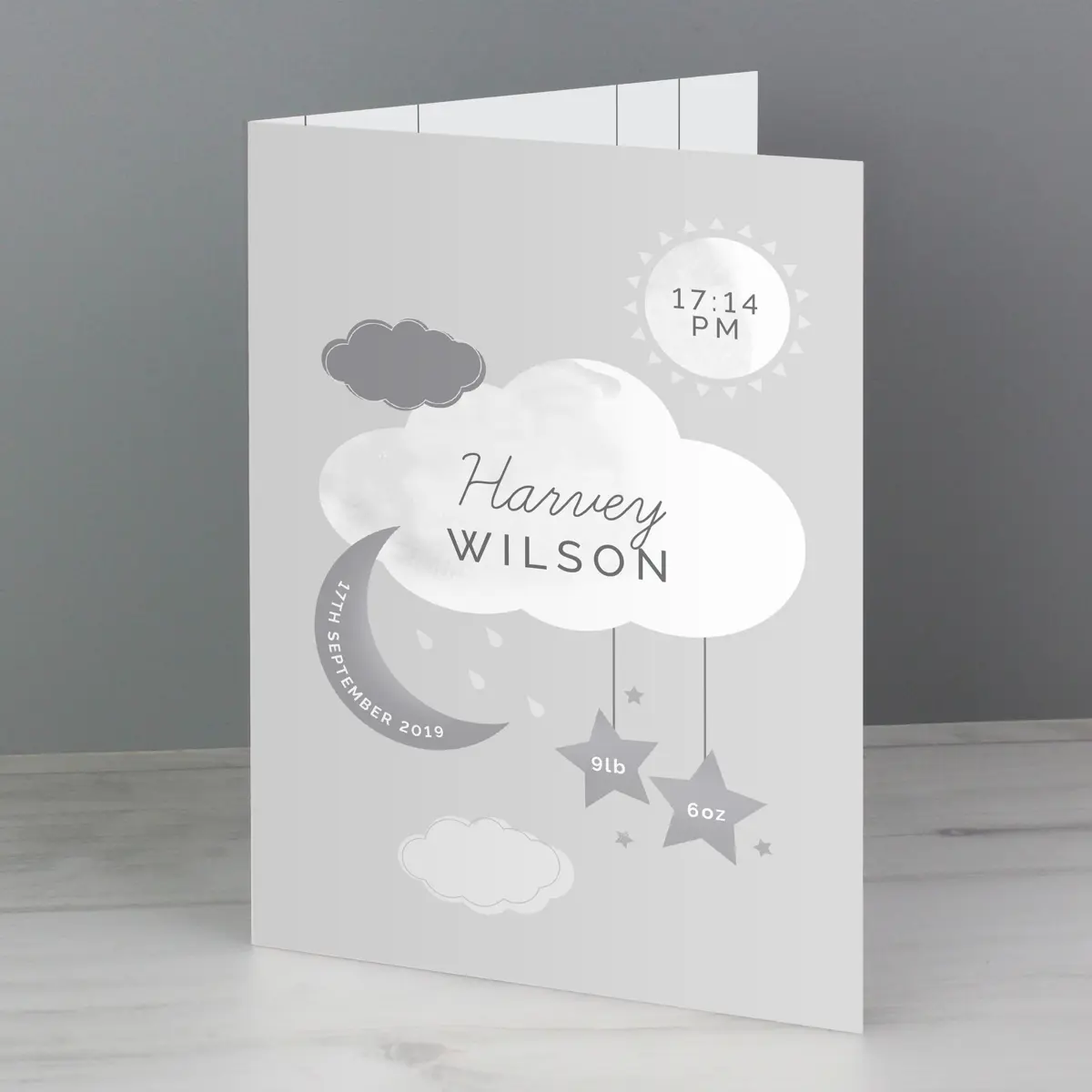 Welcome a precious new arrival with this beautiful personalised moon and stars card. Featuring a charming celestial design with the sun, clouds, moon and stars, it is a thoughtful way to celebrate a baby’s birth and create a keepsake that parents will treasure.