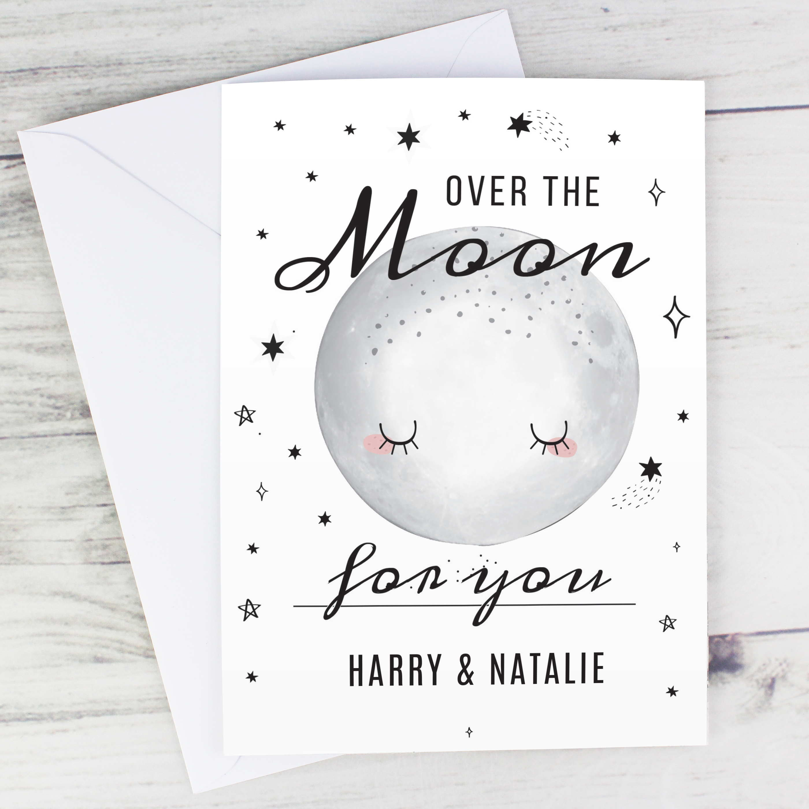• Fixed wording on the card reads: ‘Over the moon for you’