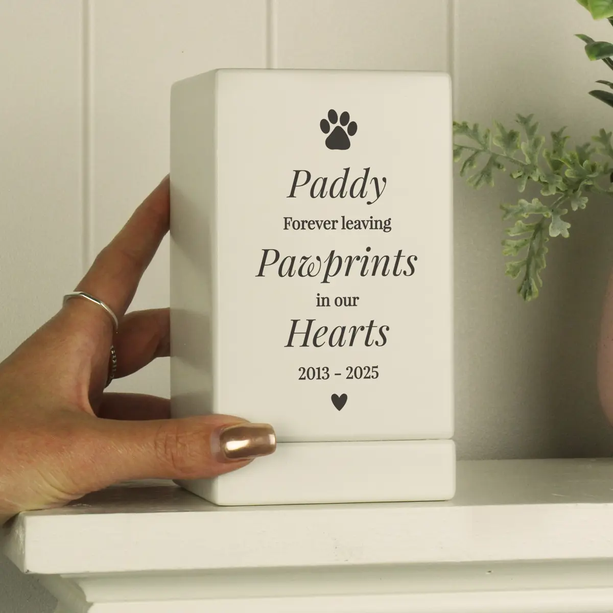 Keep the memory of your beloved pet close with our Personalised Pet Pawprints Small Wooden Urn. Crafted from high-quality wood, this beautiful urn features a simple paw print design, along with a personal message, making it a truly unique and heartfelt tribute.