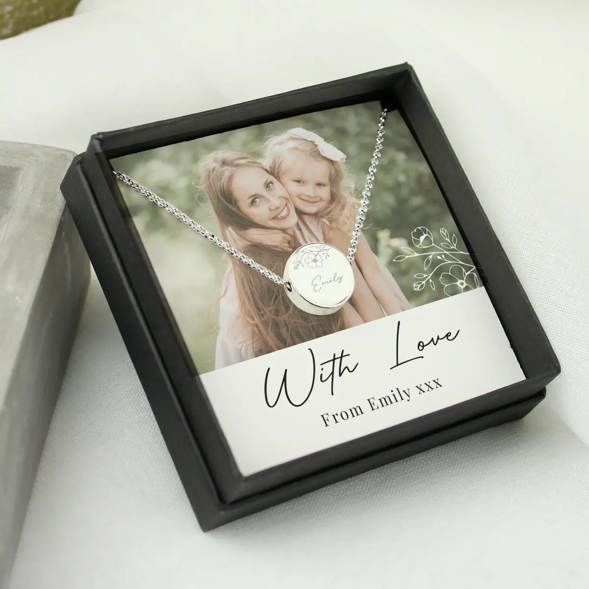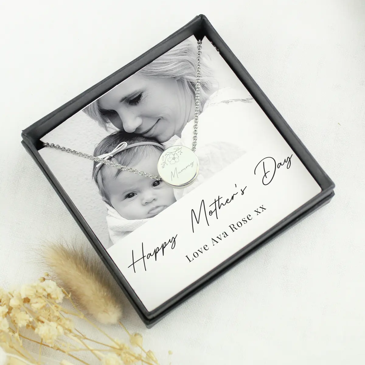 Perfect for Mother’s Day or birthdays, this unique gift set allows you to upload a cherished image and personalise both the sentiment card and pendant for a truly personal touch. Presented in a stylish black gift box, it is ready to give and sure to be treasured for years to come.