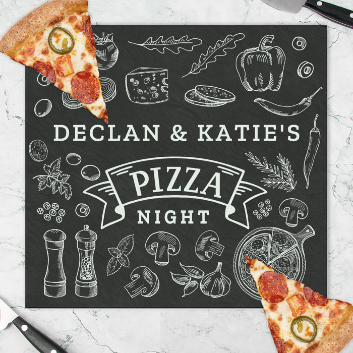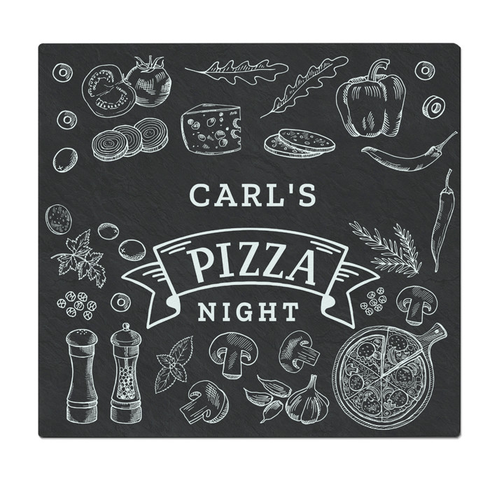 You can personalise this pizza design glass chopping board with any message up to 1 line of text with 20 characters available per line.