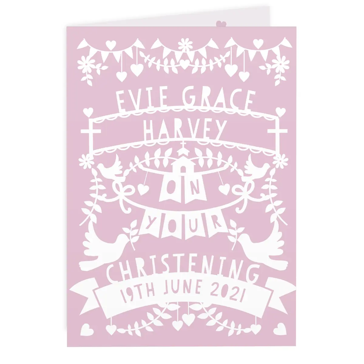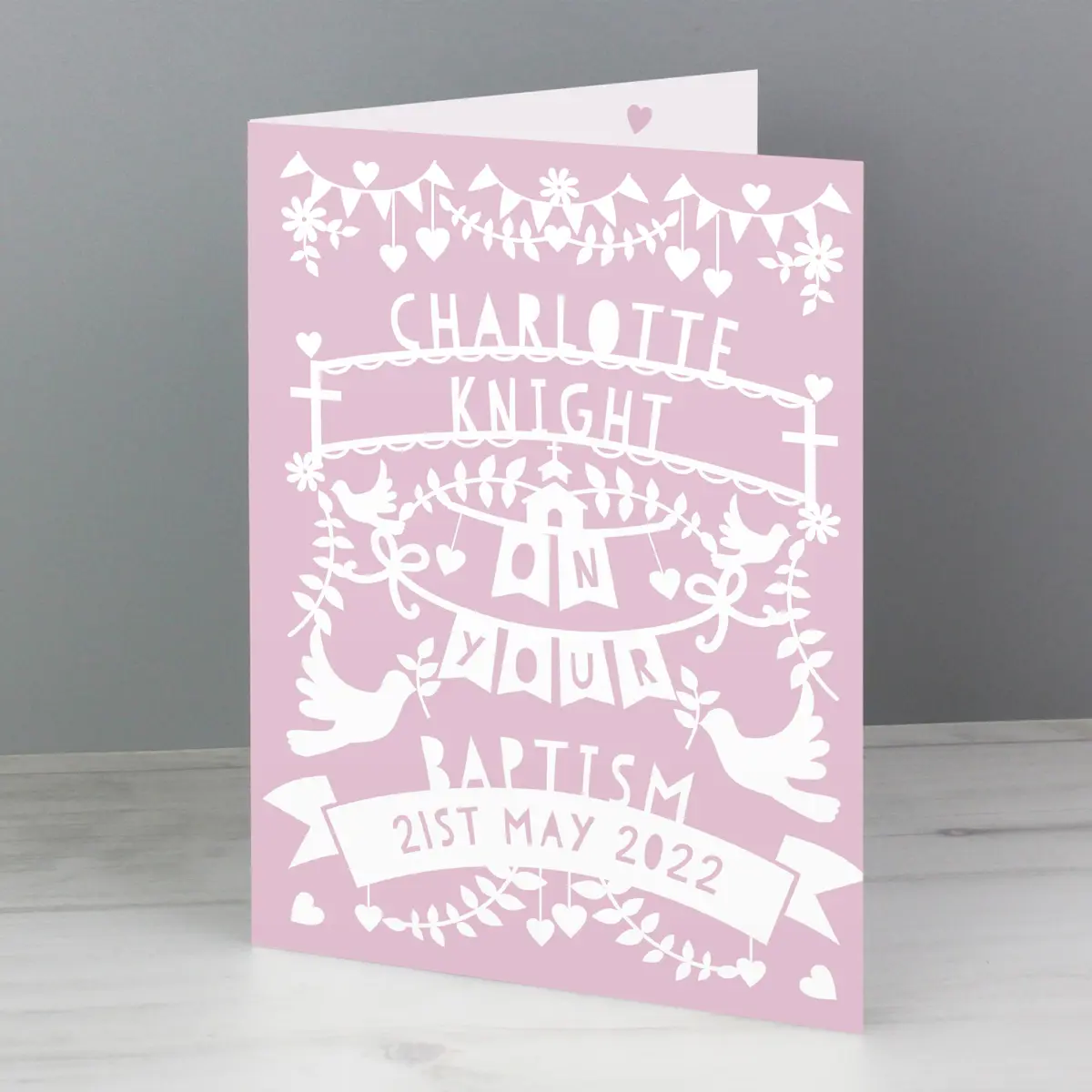 Celebrate a special religious milestone with this beautiful Personalised Pink Papercut Style Card, designed with a delicate and timeless look. Perfect for Christenings, Baptisms, Weddings, and more, it’s a thoughtful keepsake that will be treasured for years to come.