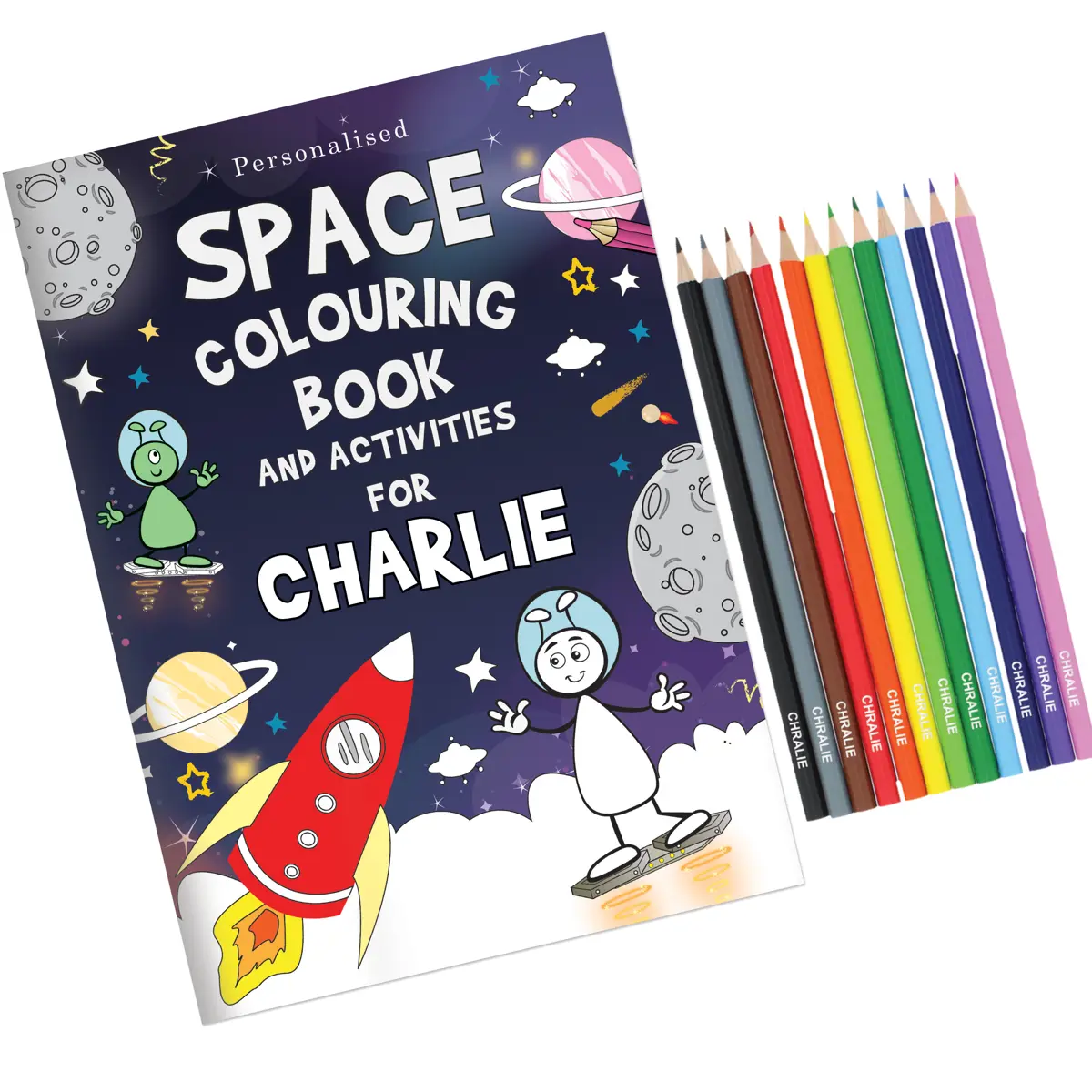 Personalise this Space Colouring set with a name up to 12 characters. The name will be featured on the front of the colouring book and on the colouring pencils.