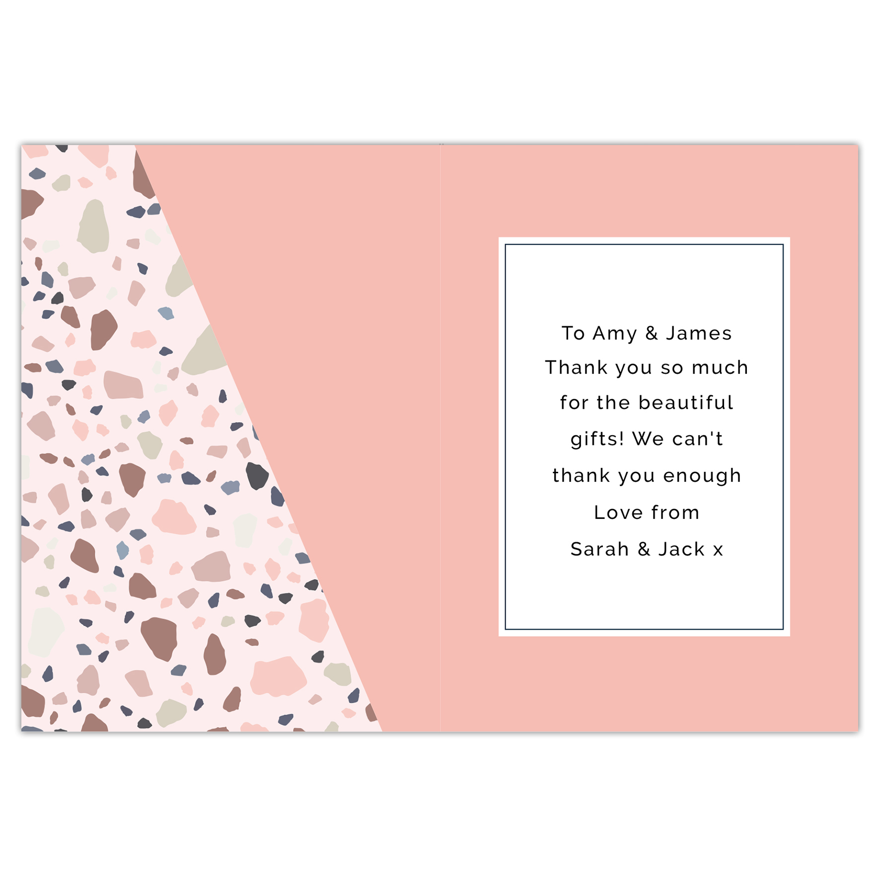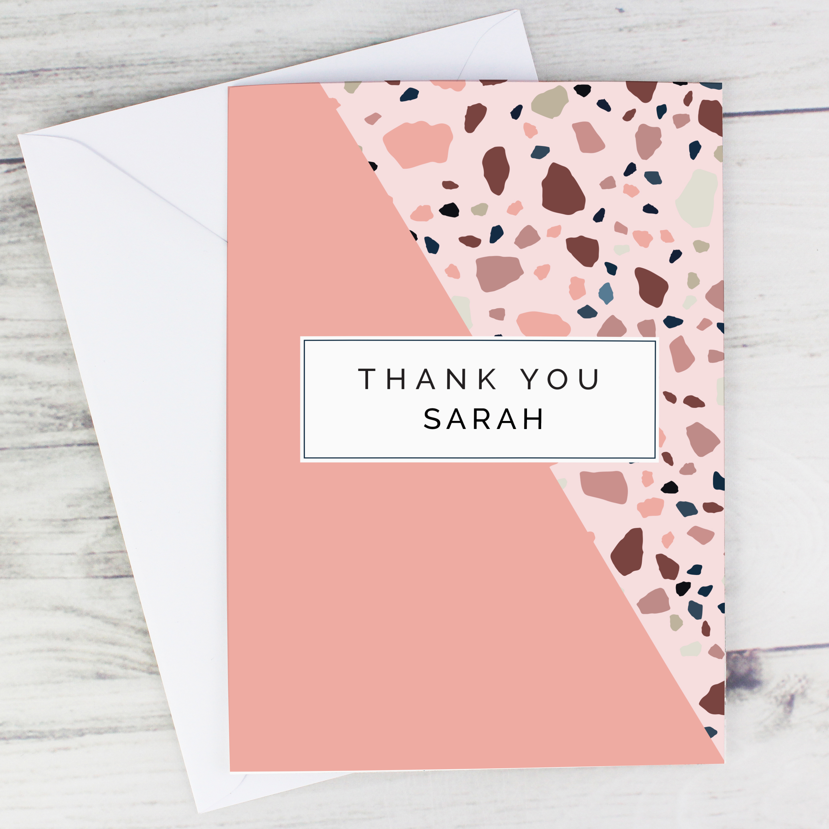 Show your gratitude in style with this modern personalised thank you card. Featuring the fixed words “THANK YOU” in a bold terrazzo design, it is a thoughtful way to let a friend, loved one, or teacher know how much you appreciate them.