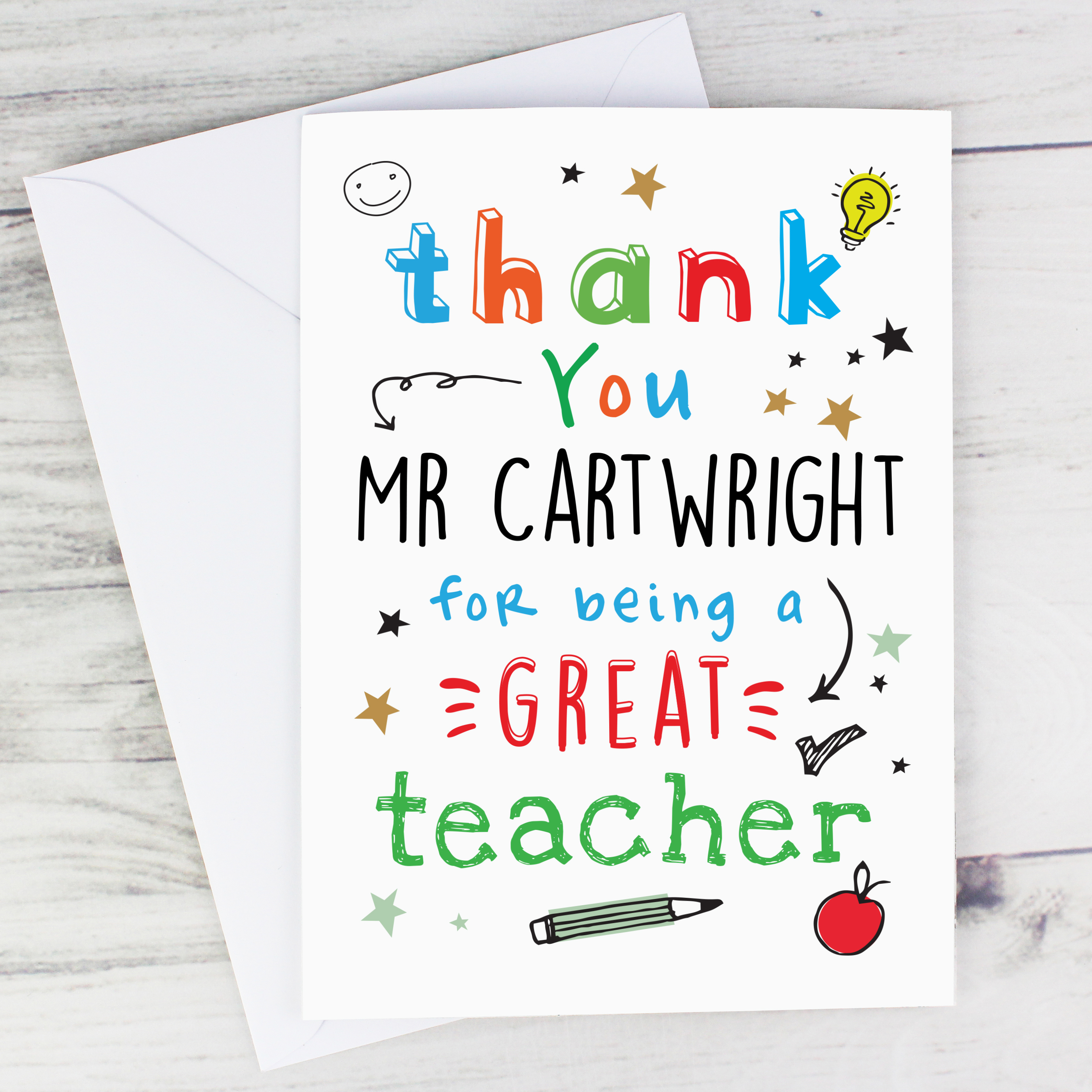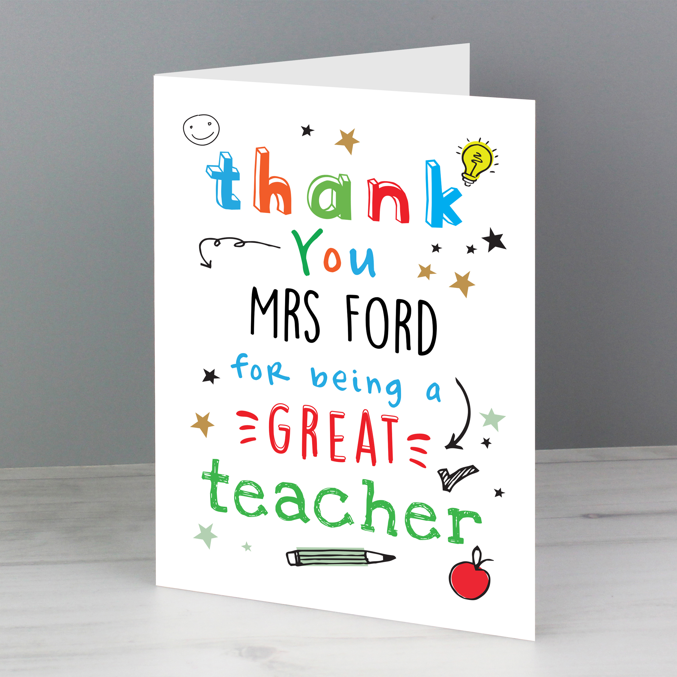 Say a heartfelt thank you to a wonderful teacher with this bright and colourful personalised card. Featuring the fixed words “Thank you for being a great teacher,” it is the perfect way for children and families to show their appreciation at the end of term or on a special occasion.