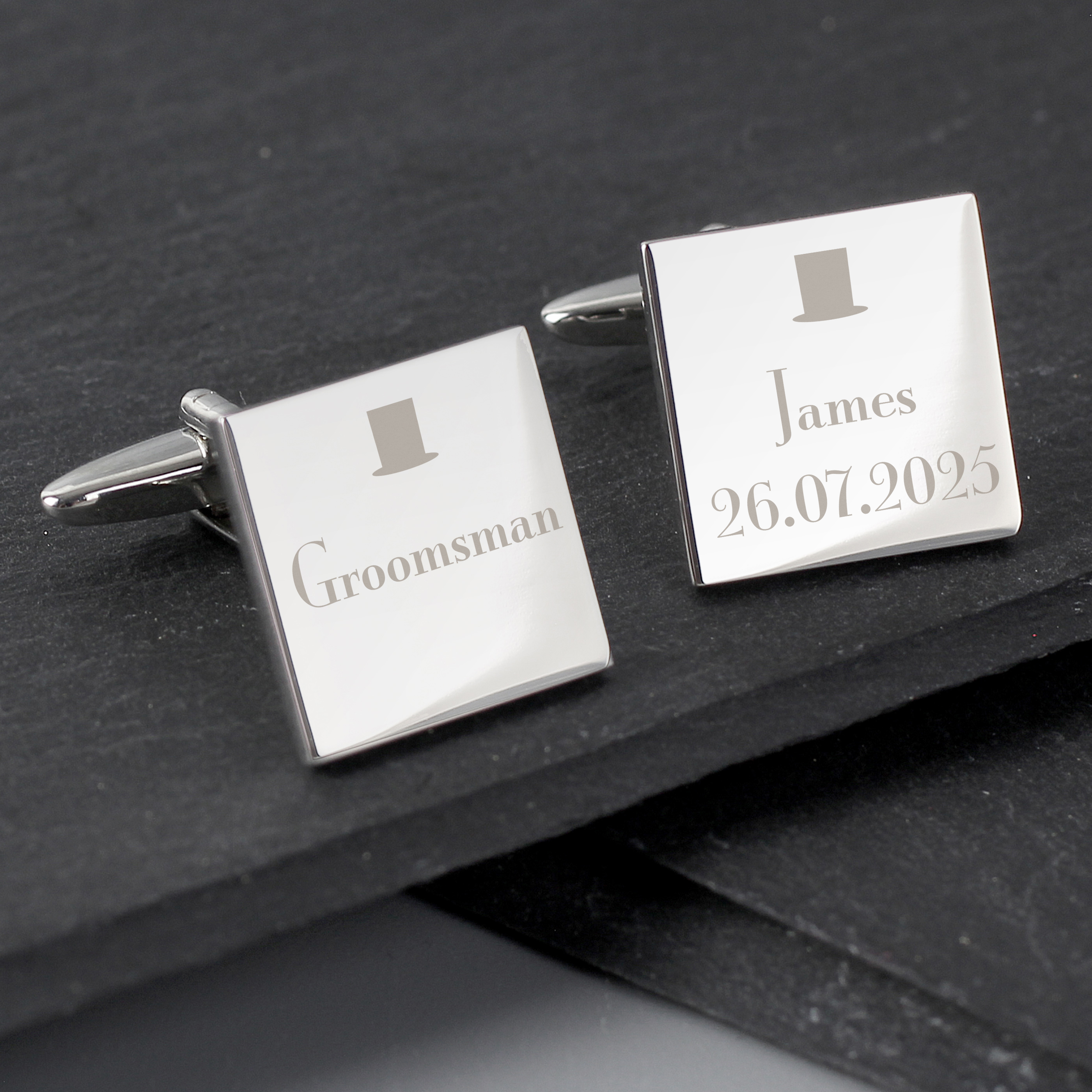 Cufflinks are presented in a hard black plastic box.