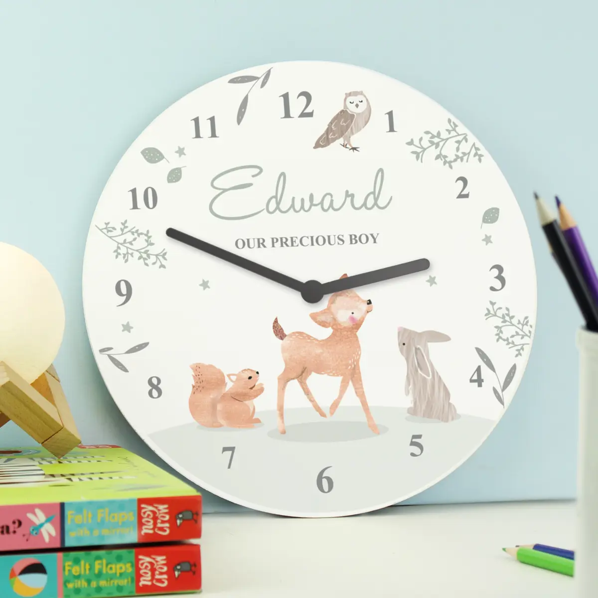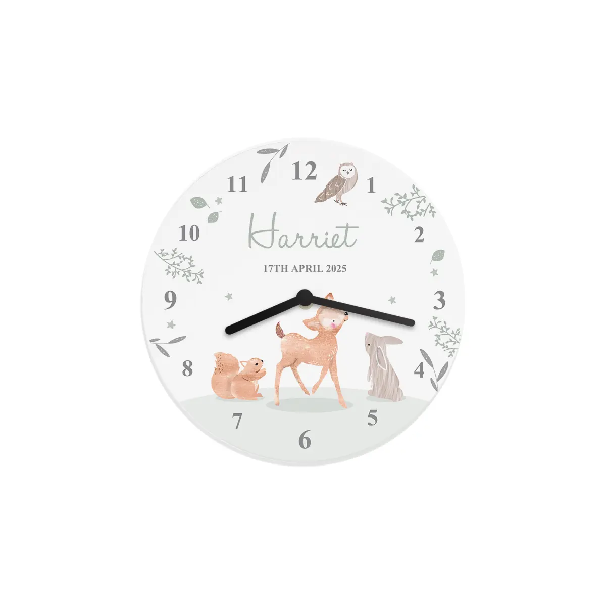 This beautifully crafted clock features our sweet woodland animal design, perfect for little ones!