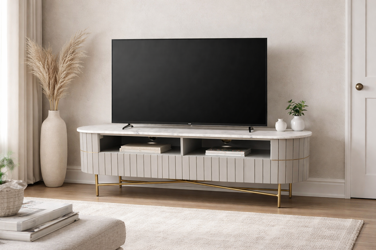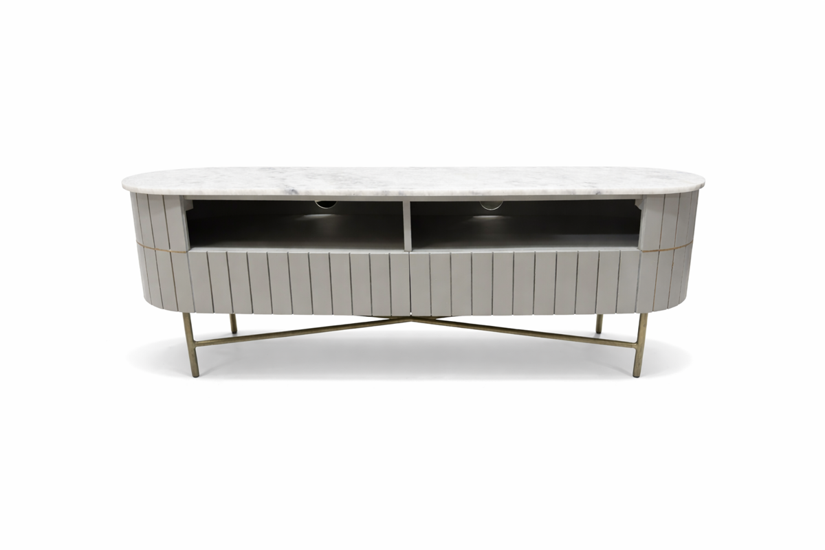 Elevate your living space with the Piano Fluted Mango Wood & Marble TV Unit. Combining natural materials with timeless design, this elegant piece features beautifully fluted mango wood detailing and a luxurious marble top, creating a sophisticated focal point for any modern home.