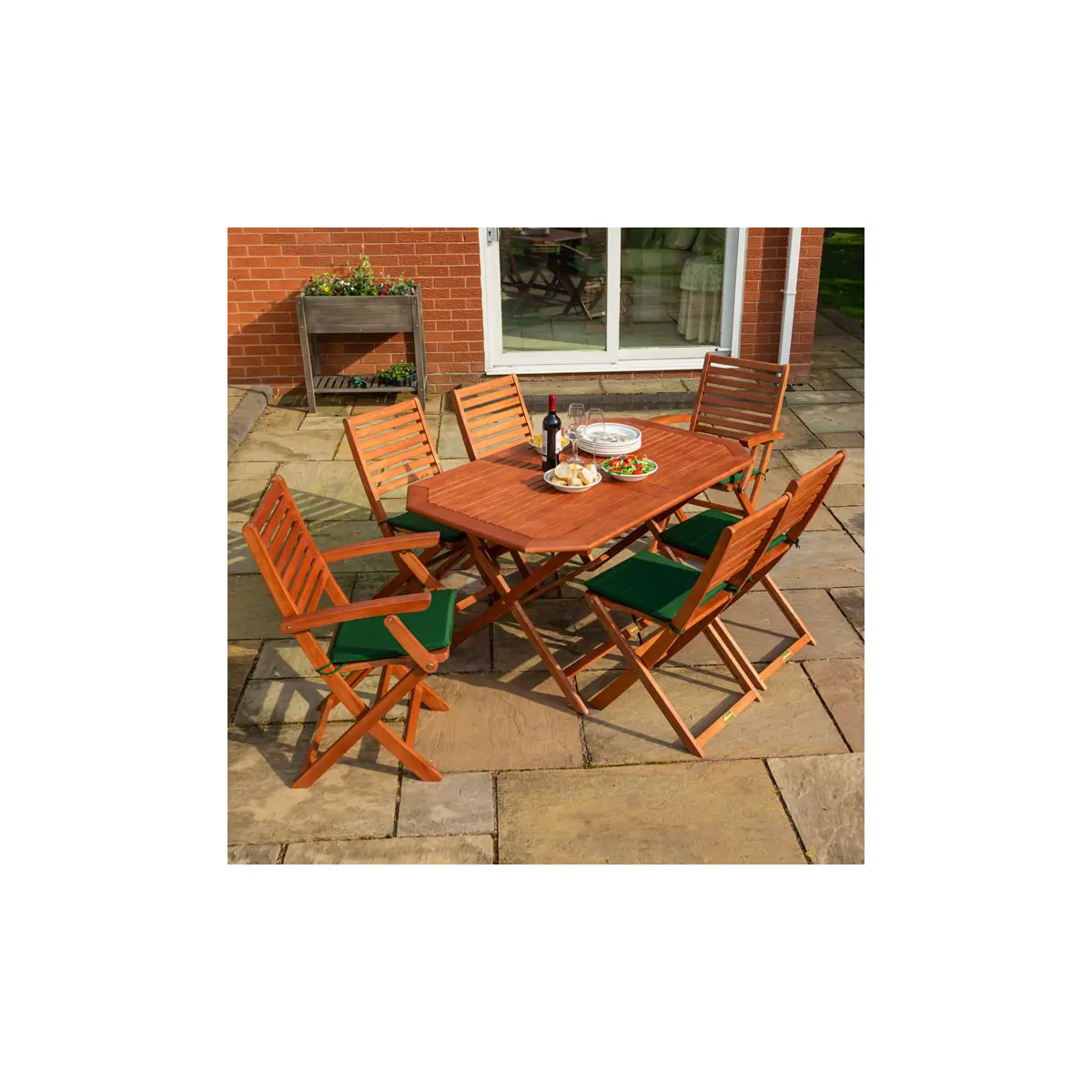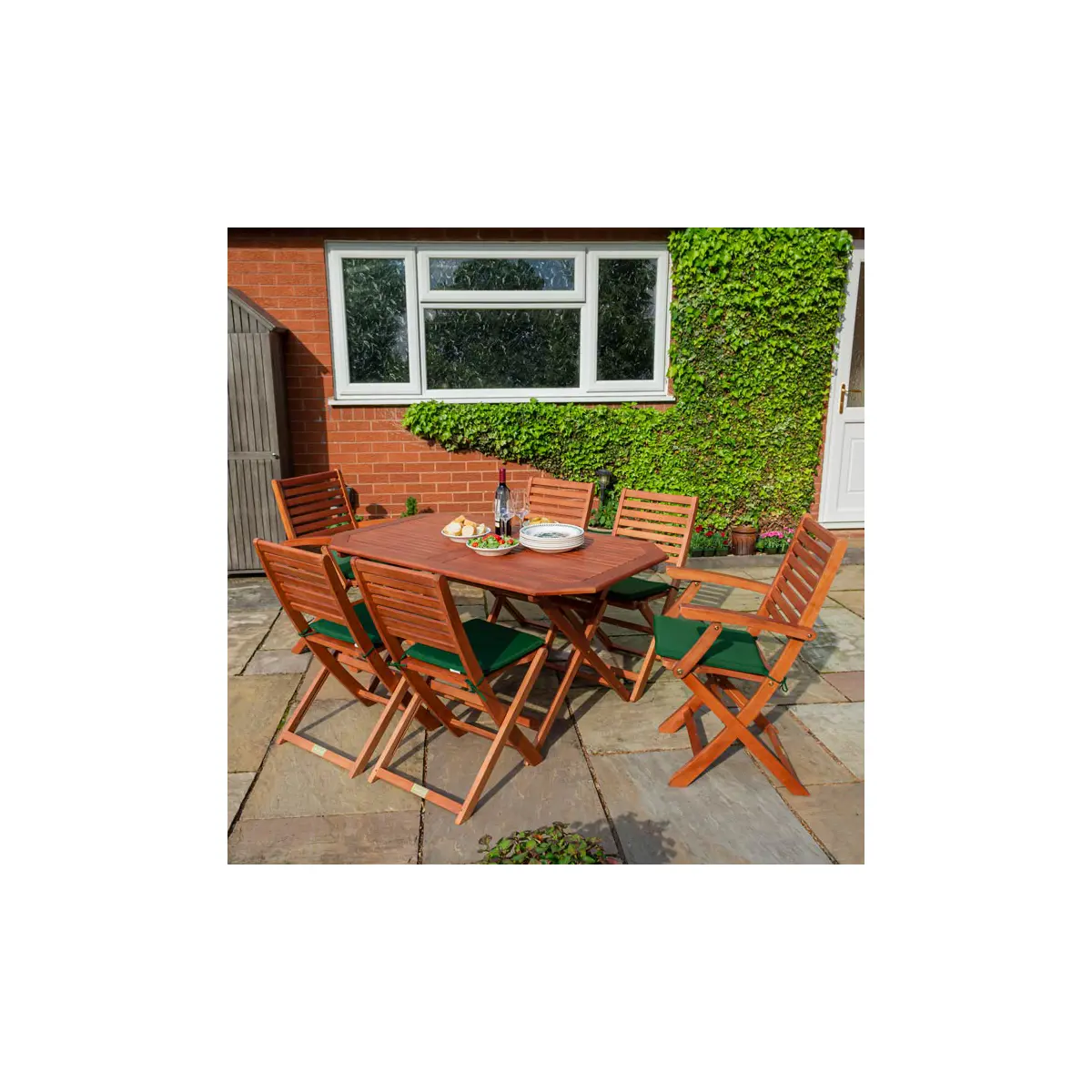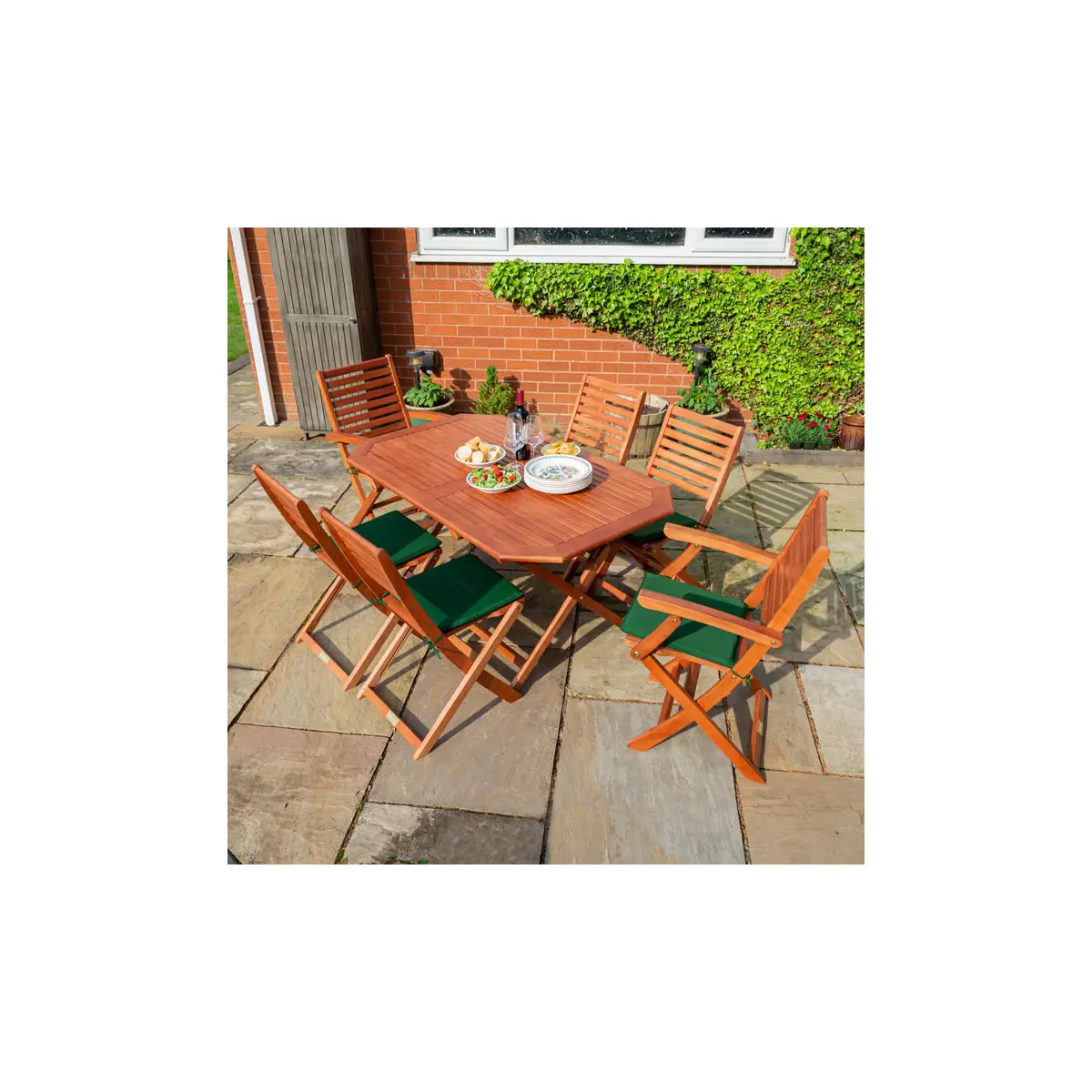 Create the perfect outdoor dining experience with the Plumley Six Seater Dining Set, featuring plush green cushions and a beautifully crafted design. This 7-piece set combines comfort, style, and practicality, making it an ideal addition to your garden, patio, or outdoor living space.
