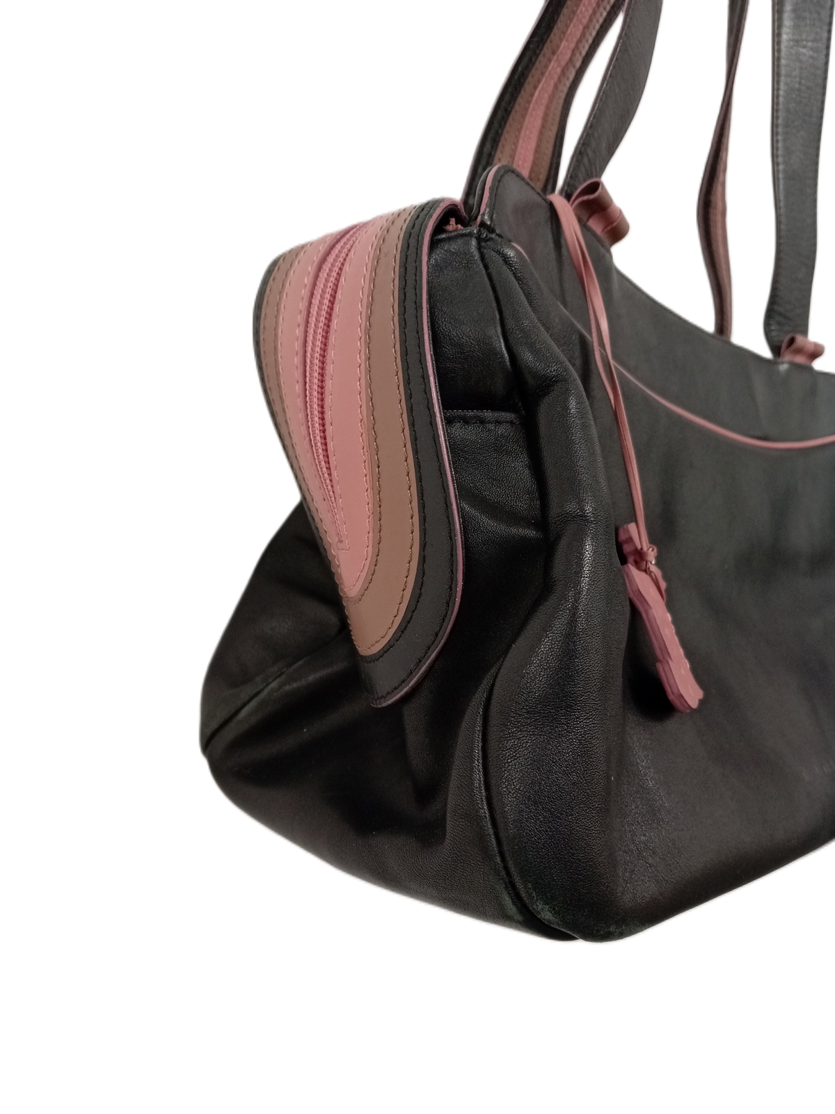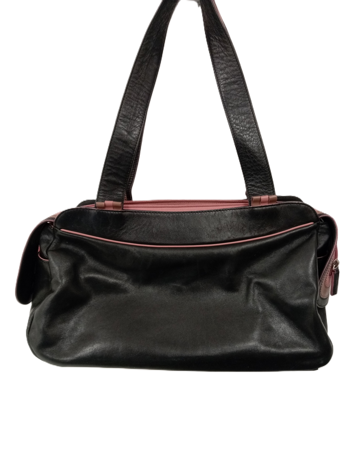 • Sleek black leather body accented with soft pink detailing for a chic contrast