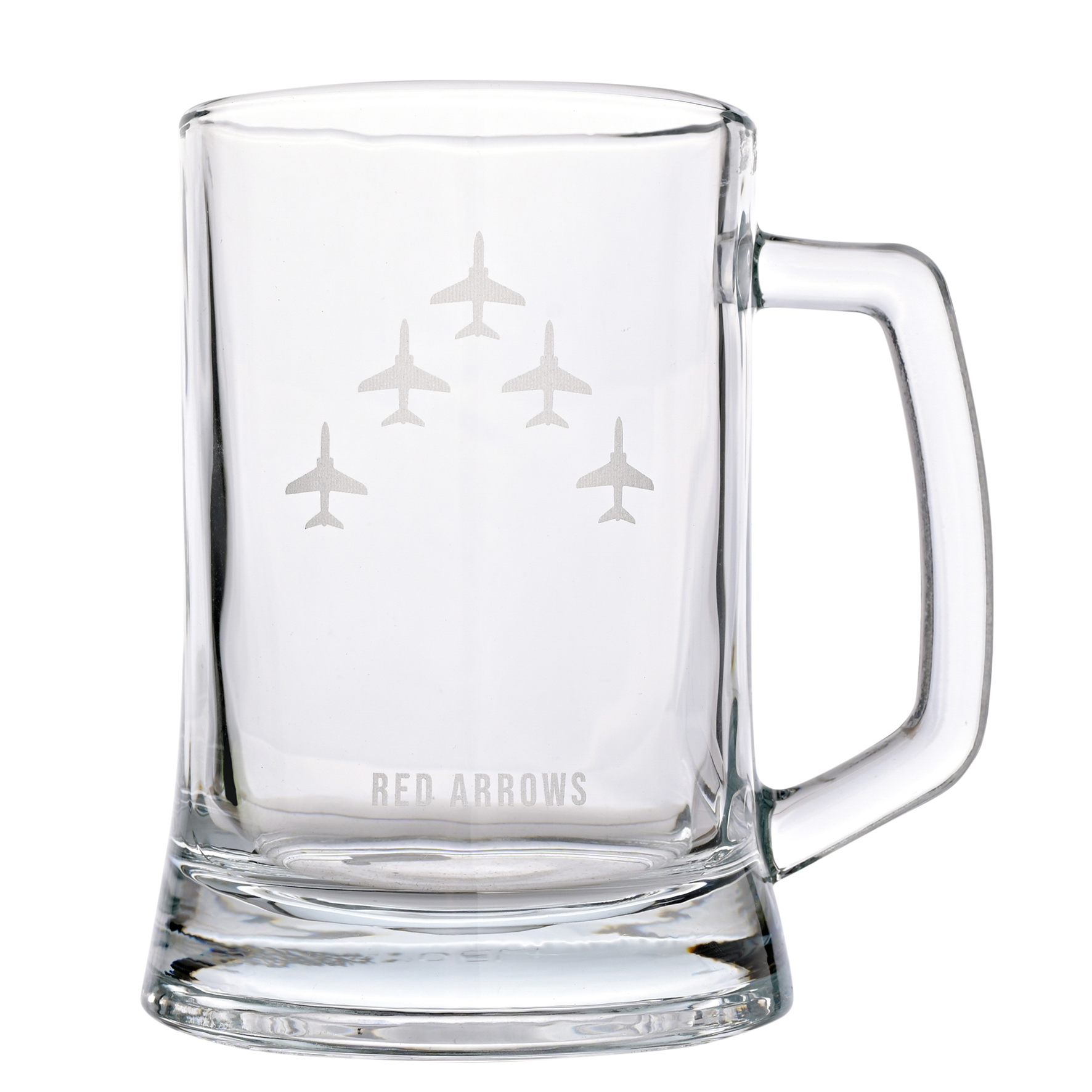 Engage aviation fans with this stunning RAF etched glass tankard. Featuring the iconic Red Arrows Hawk jets in flight, this glass showcases the breath-taking aerobatics of the RAF's world-famous display team. With a sleek, modern design, it makes a striking addition to any barware collection. Expertly etched with fine details, it's crafted from clear glass to highlight the etched design. Perfect for serving everything from ales to juices, it's a must-have for any aviation enthusiast or proud Brit.