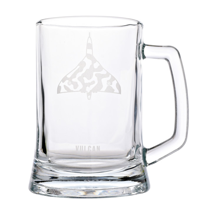 Help customers celebrate Britain's aviation heritage with this stylish RAF etched glass tankard showing the iconic Vulcan bomber. Etched with the distinctive shape of the jet, the mug allows users to feel like they're on the airfield. Its sturdy, clear glass construction provides optimal visibility of the authentic artwork while protecting the beverage. The mug's thick curved handle and weighted bottom gives it a nice solid feel in the hand.