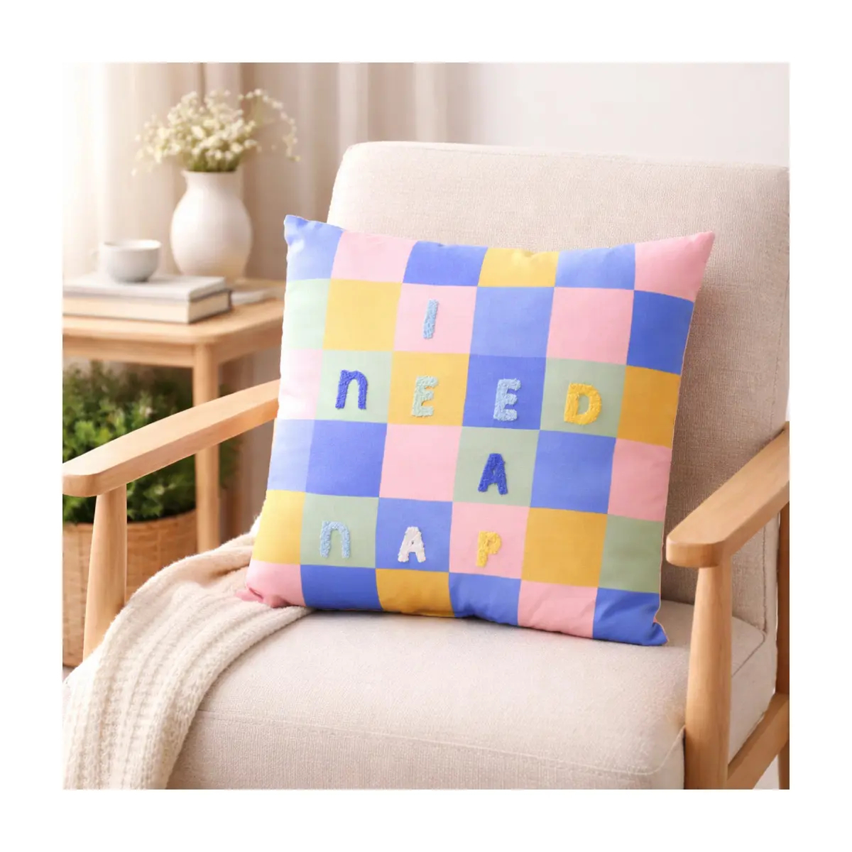 • Embroidered fabric cushion with a humorous "I Need A Nap" slogan