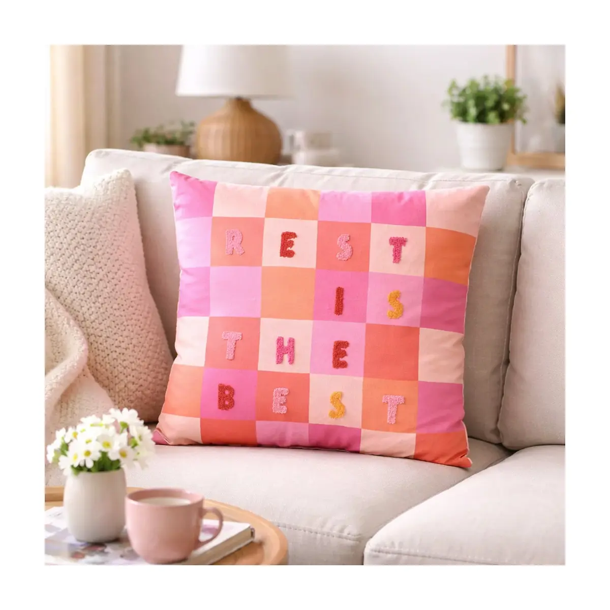 Brighten up your space with the Raspberry Blossom Cushion – "Rest Is The Best", a playful reminder to pause and recharge. With its vibrant checkerboard pattern of pink, orange, and peach squares, this decorative cushion adds both colour and positivity to your home.