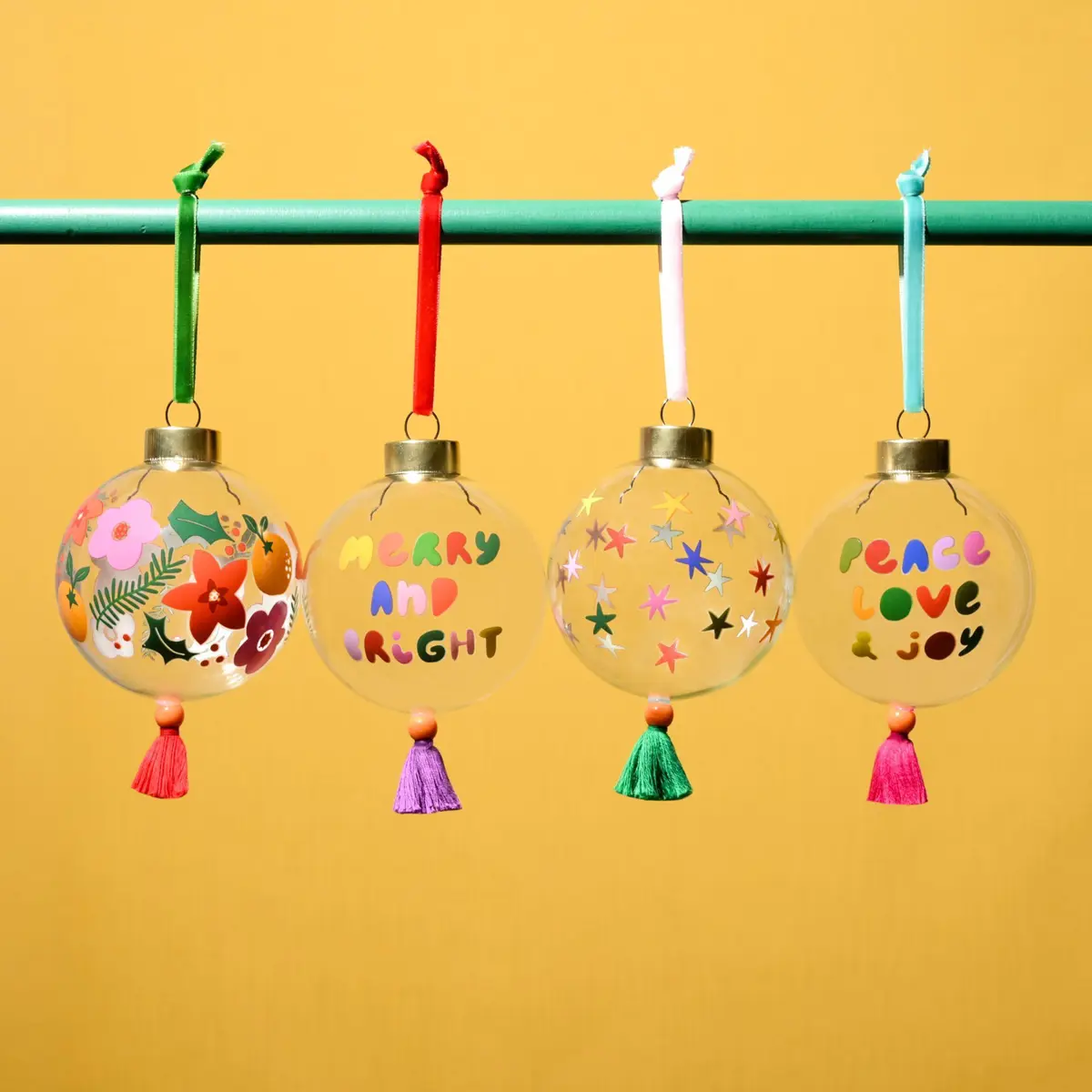 Each glass bauble is hand-painted and finished to the highest quality, featuring colourful tassels, velvet ribbon, and gold-coloured caps for a festive and luxurious look.