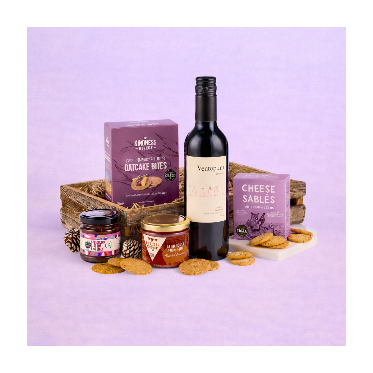 Enjoy the smooth, fruity Ventopuro Merlot paired with Cottage Delight Sobrasada Pâté for a touch of Spanish-inspired indulgence. Complementing these are Pea Green Boat Cheese Sables with cumin seeds, The Kindness Bakery Ploughman’s Oatcake Bites, and a rich Fruits of the Forage Red Onion & Plum Chutney – a combination designed for relaxed grazing and sharing.