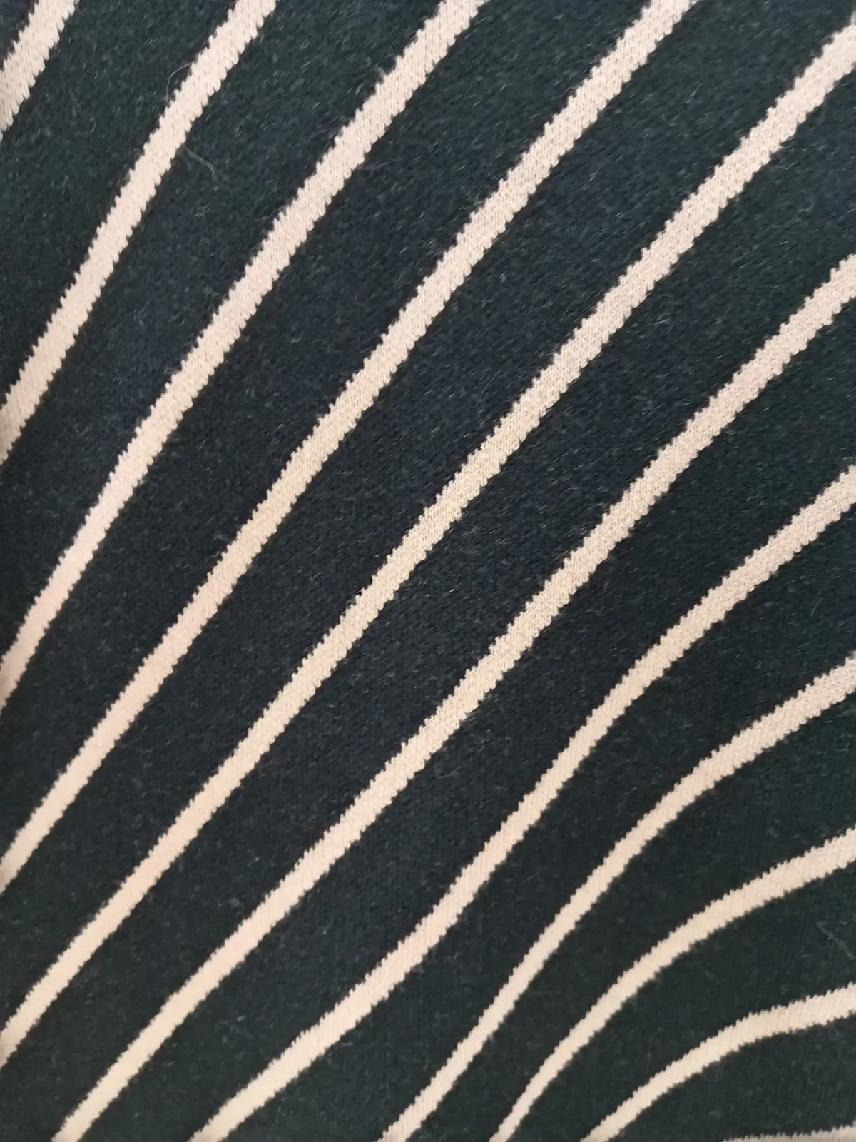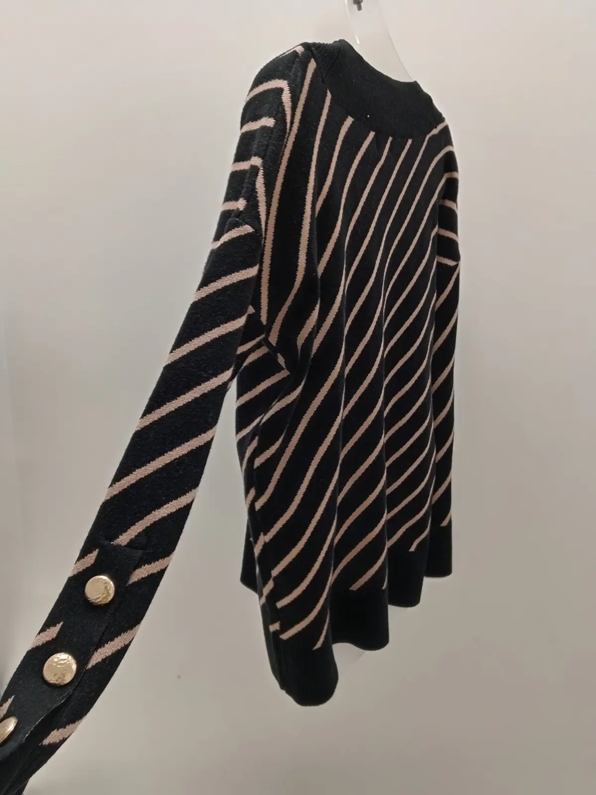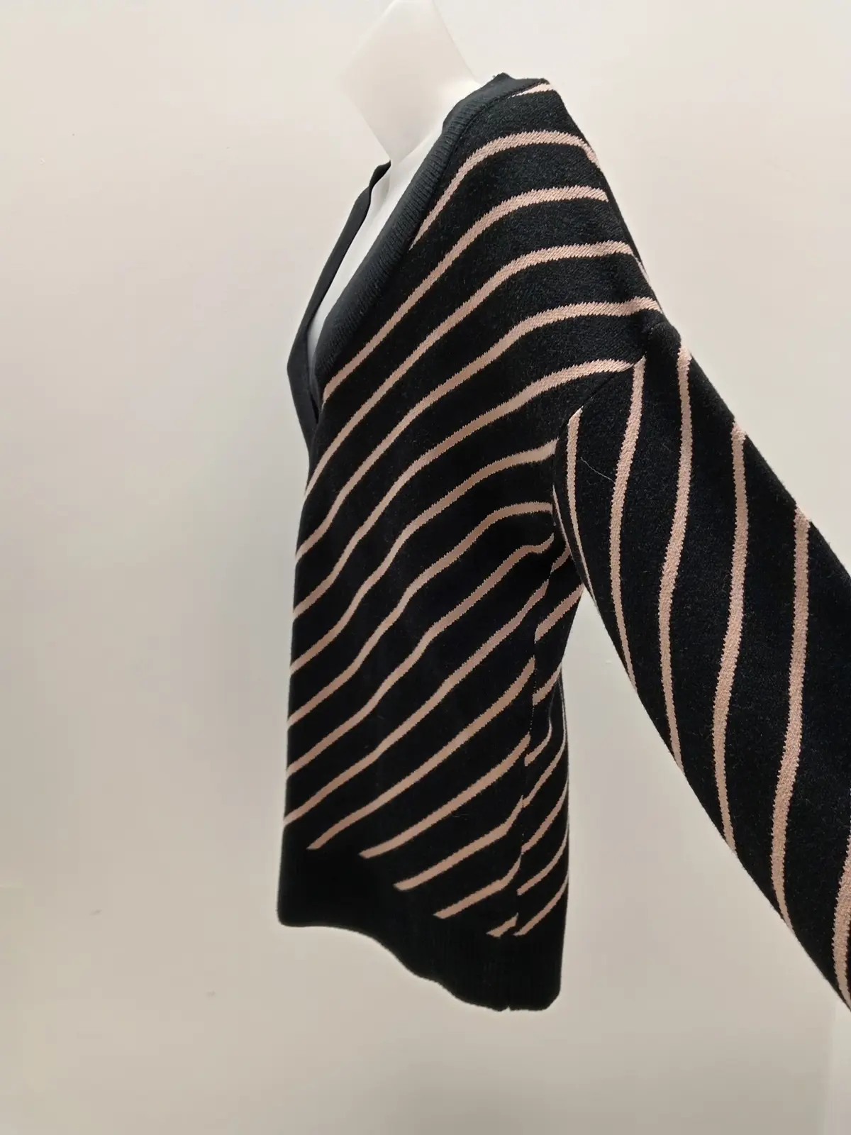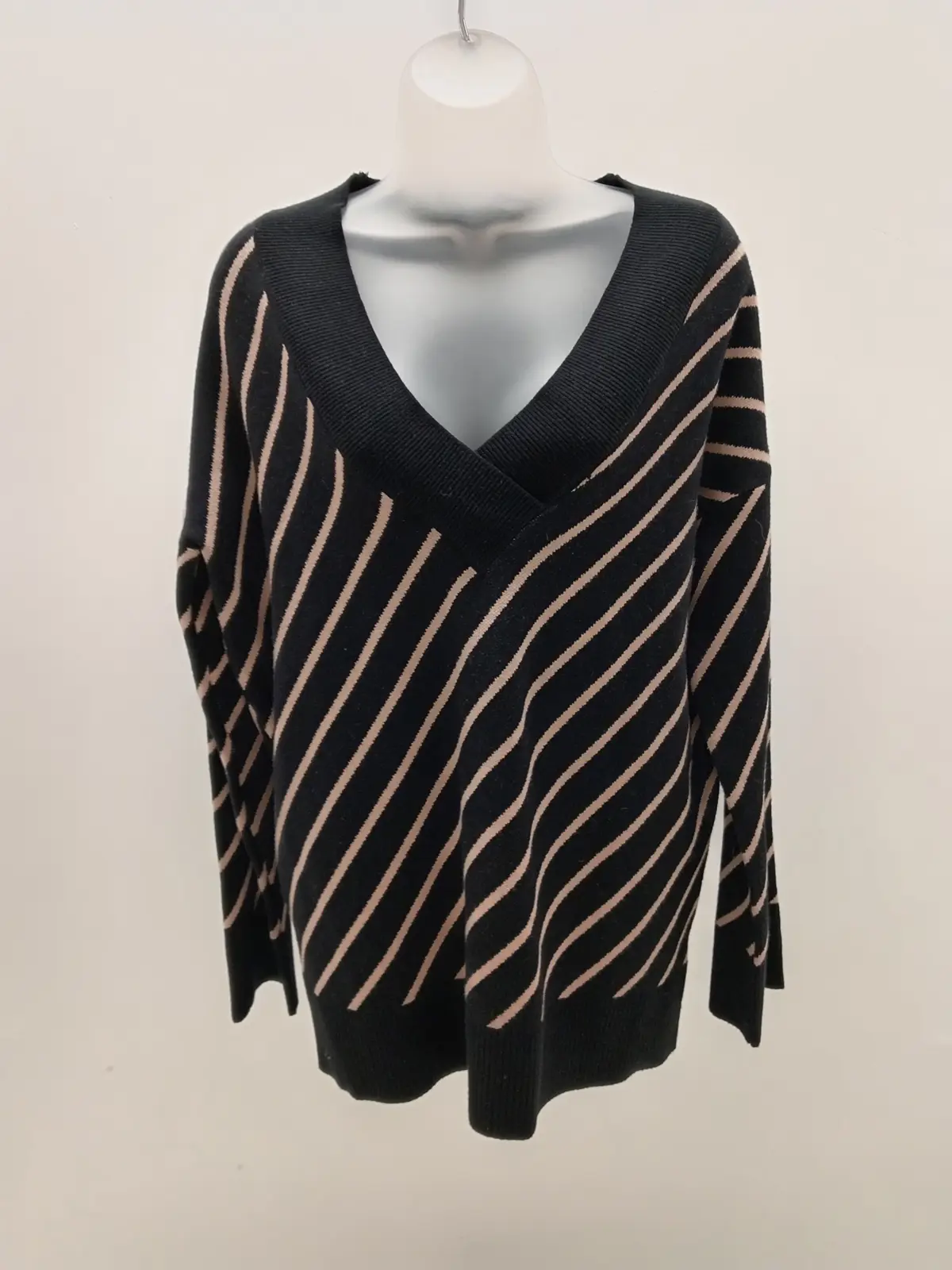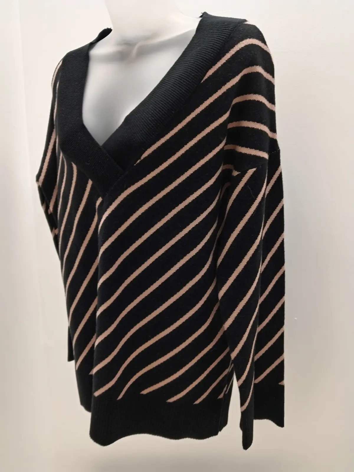 This stylish knit features a classic V-neckline and a bold black and beige stripe pattern, offering a versatile look that can be dressed up or down. Designed with comfort in mind, the soft fabric and relaxed fit make it an effortless option for everyday wear.
