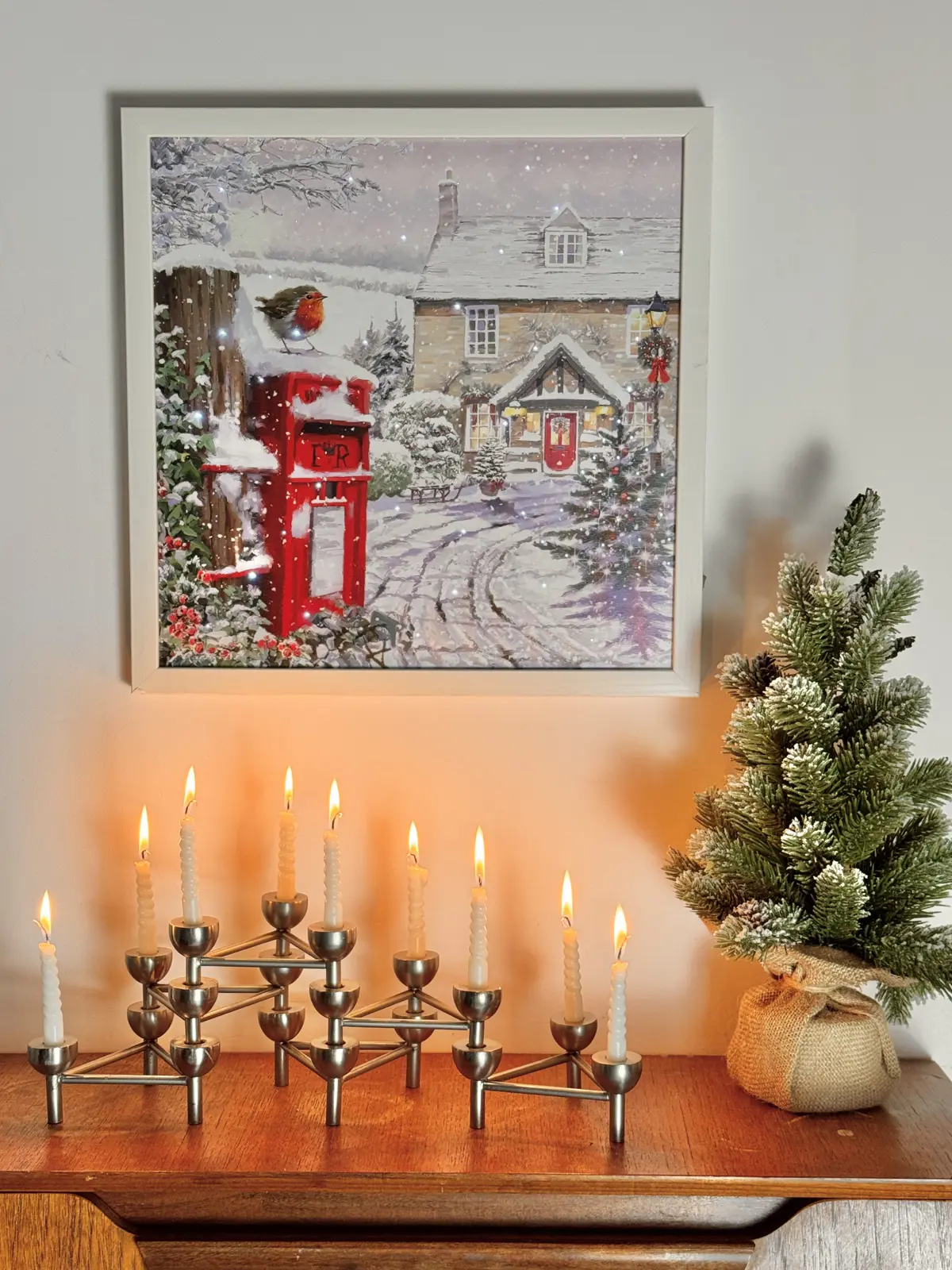Bring a classic winter scene to life with this charming Robin on Postbox LED canvas. Featuring artwork by Richard Macneil, it captures the warmth and nostalgia of the festive season, complete with glowing fibre optic lights that gently illuminate the snowy setting. A hidden vibration switch activates the lights with a simple tap, adding a touch of magic to your home.