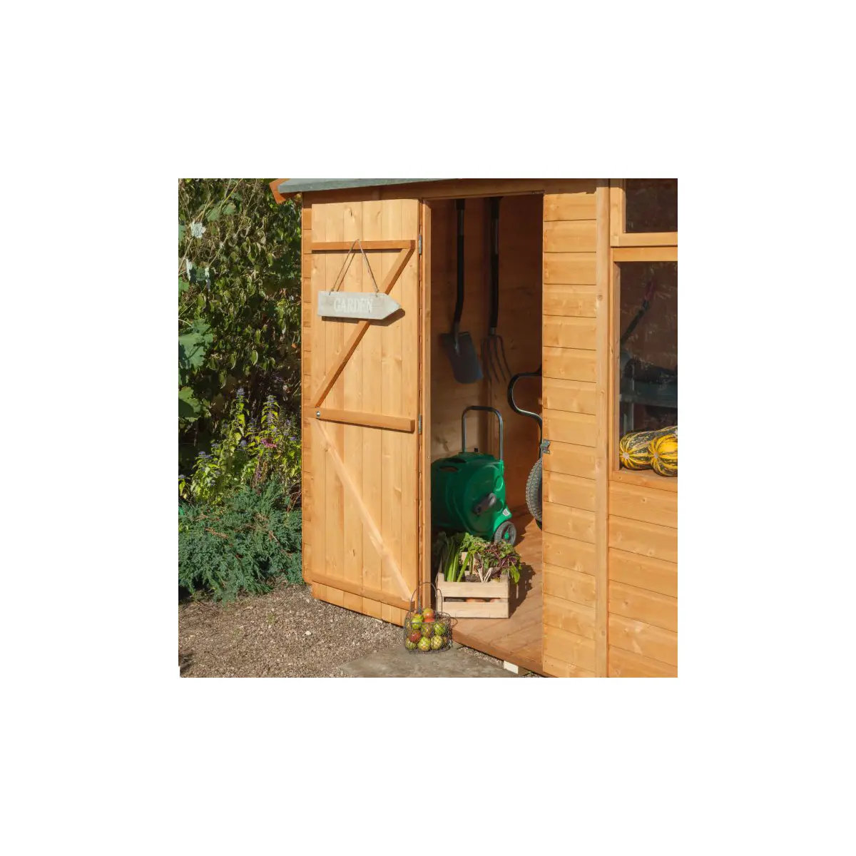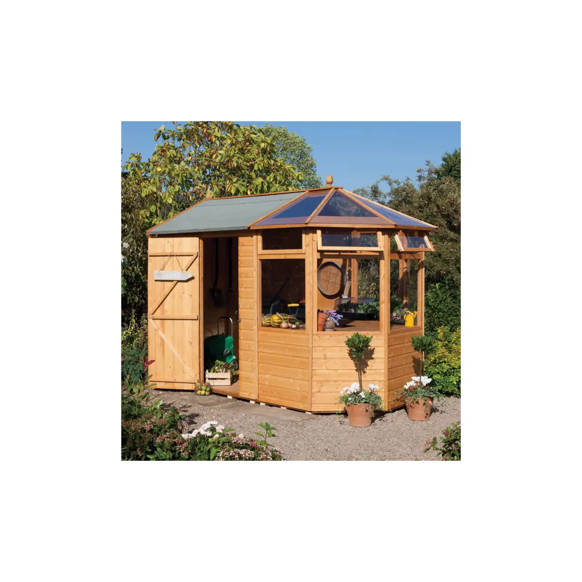This shed is equipped with features to enhance its functionality and visual appeal: