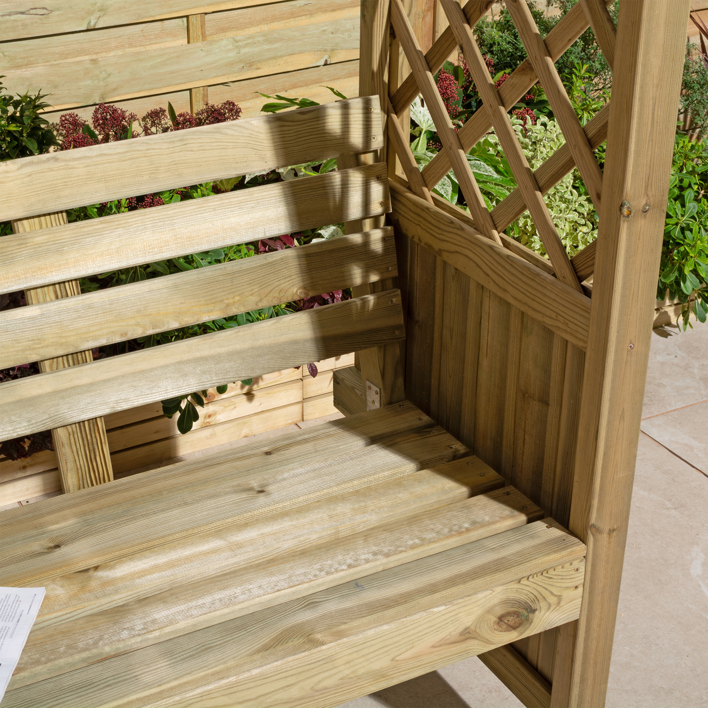 Featuring an elegant pergola-style open roof and diamond lattice side panels, it offers a light, airy feel that can be enhanced with climbing plants for a more natural finish. A built-in triangular corner table adds convenient storage for drinks, snacks, or books. Pressure treated to guard against rot, the Pemberley combines charm, comfort, and durability.