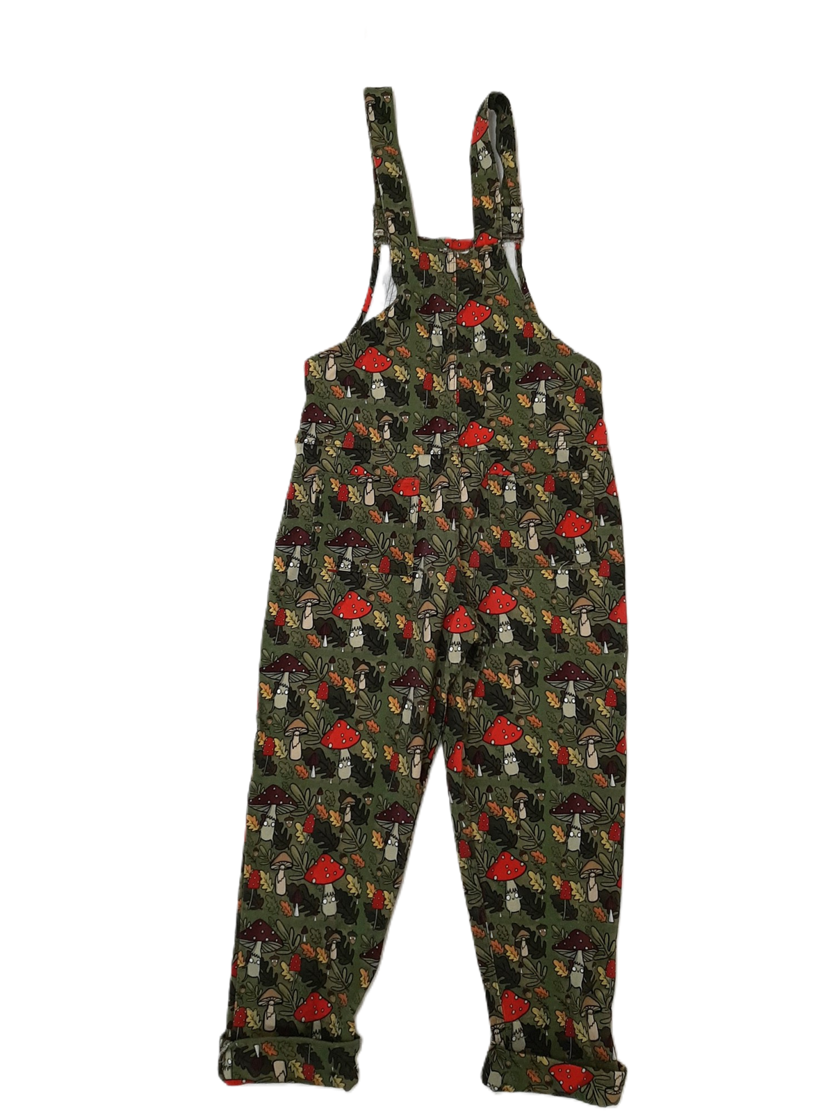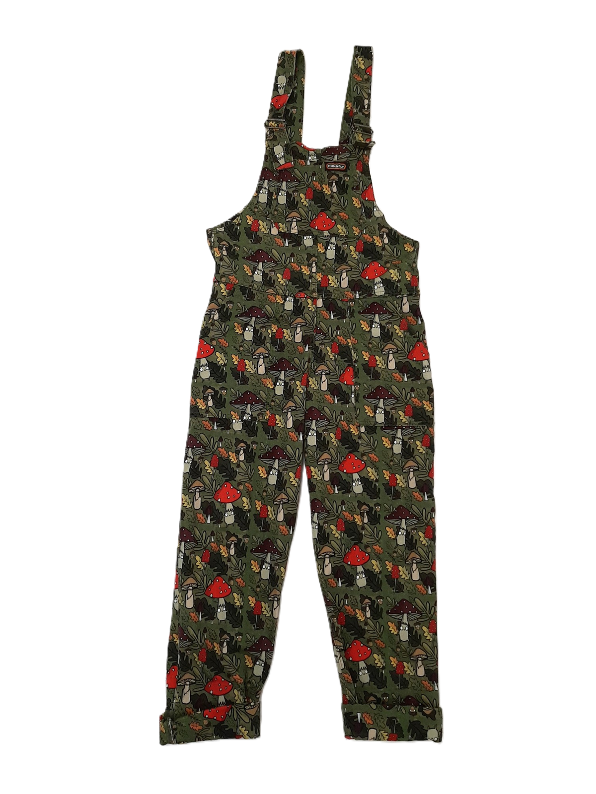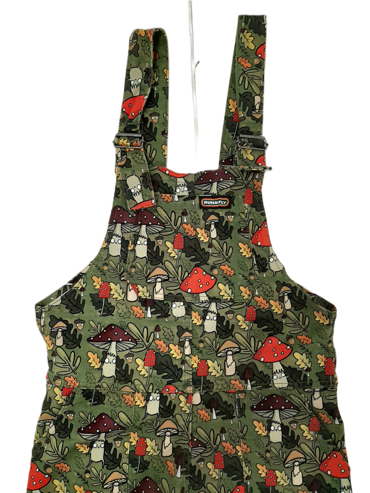 Step into whimsical woodland style with these RUN & FLY Forest Print Dungarees, featuring an adorable cartoon mushroom and forest-themed illustration on a vibrant green base. Made from 100% cotton, they're lightweight, breathable, and full of character – perfect for lovers of quirky, playful fashion.