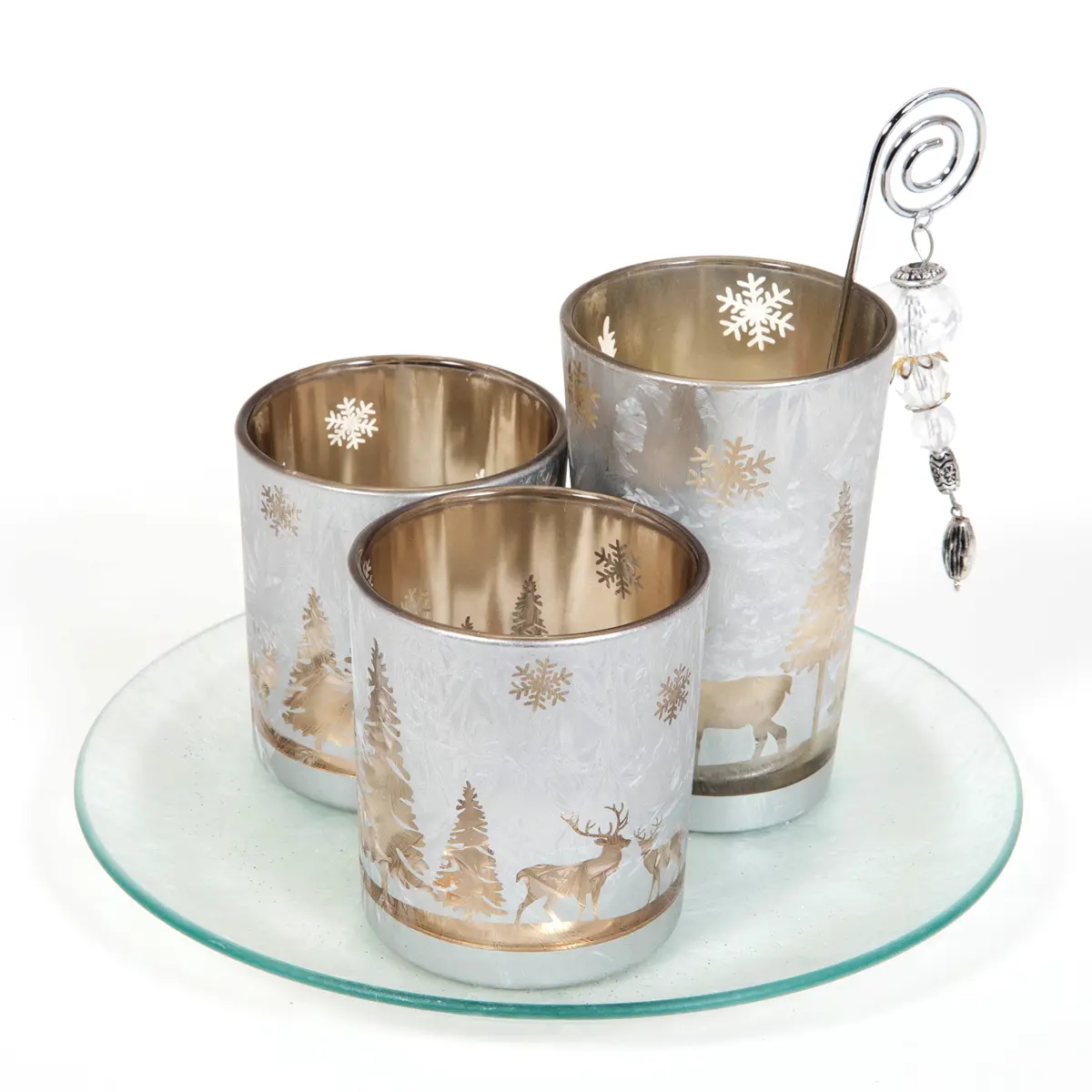 Cosy season has officially landed. Create the most magical light display with the help of this dreamy tealight set. Featuring three silver tealight holders, each one dons a sweet winter scene of snowflakes, reindeer and pine trees. When adorned with a candle, mesmerising shadows dance and flicker around the room. The accompanying glass tray provides the perfect place to display your candles, alongside a sprinkle of faux snow for a little Christmas magic. And bringing yet more character, the wire pick is the perfect finishing touch to this interior gem. H16 x W19.5 x D19.5cm.