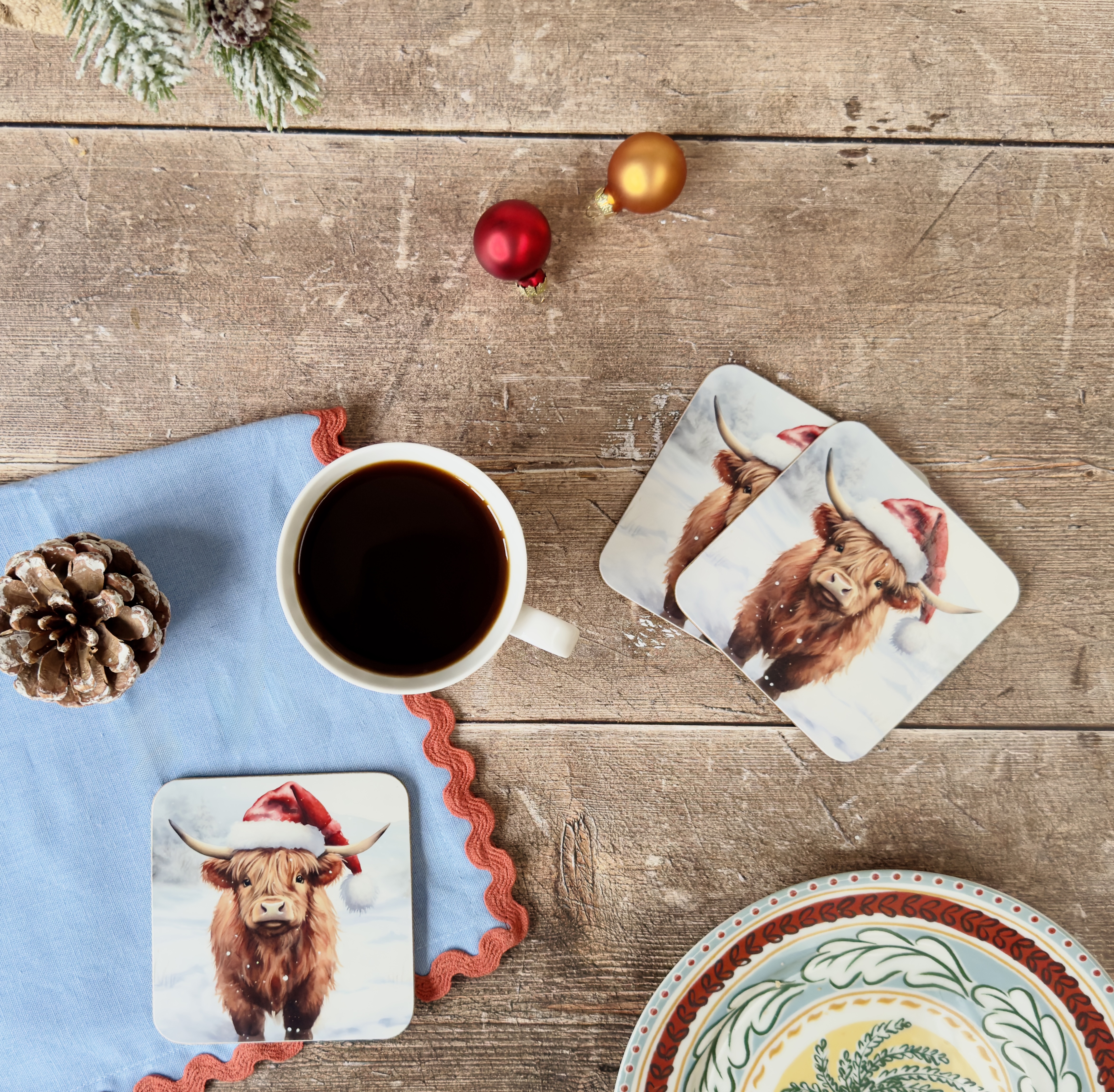 Add whimsy to your festive gatherings with our Set of 4 Christmas Highland Cow Coasters. These delightful coasters, featuring a Highland cow in a Santa hat, will surely bring smiles to guests' faces.