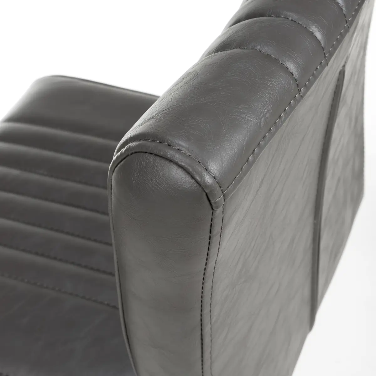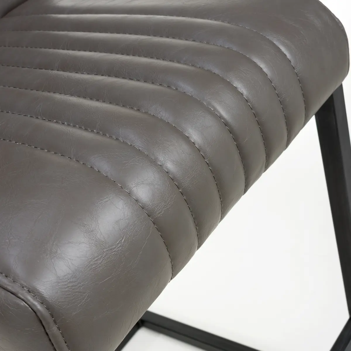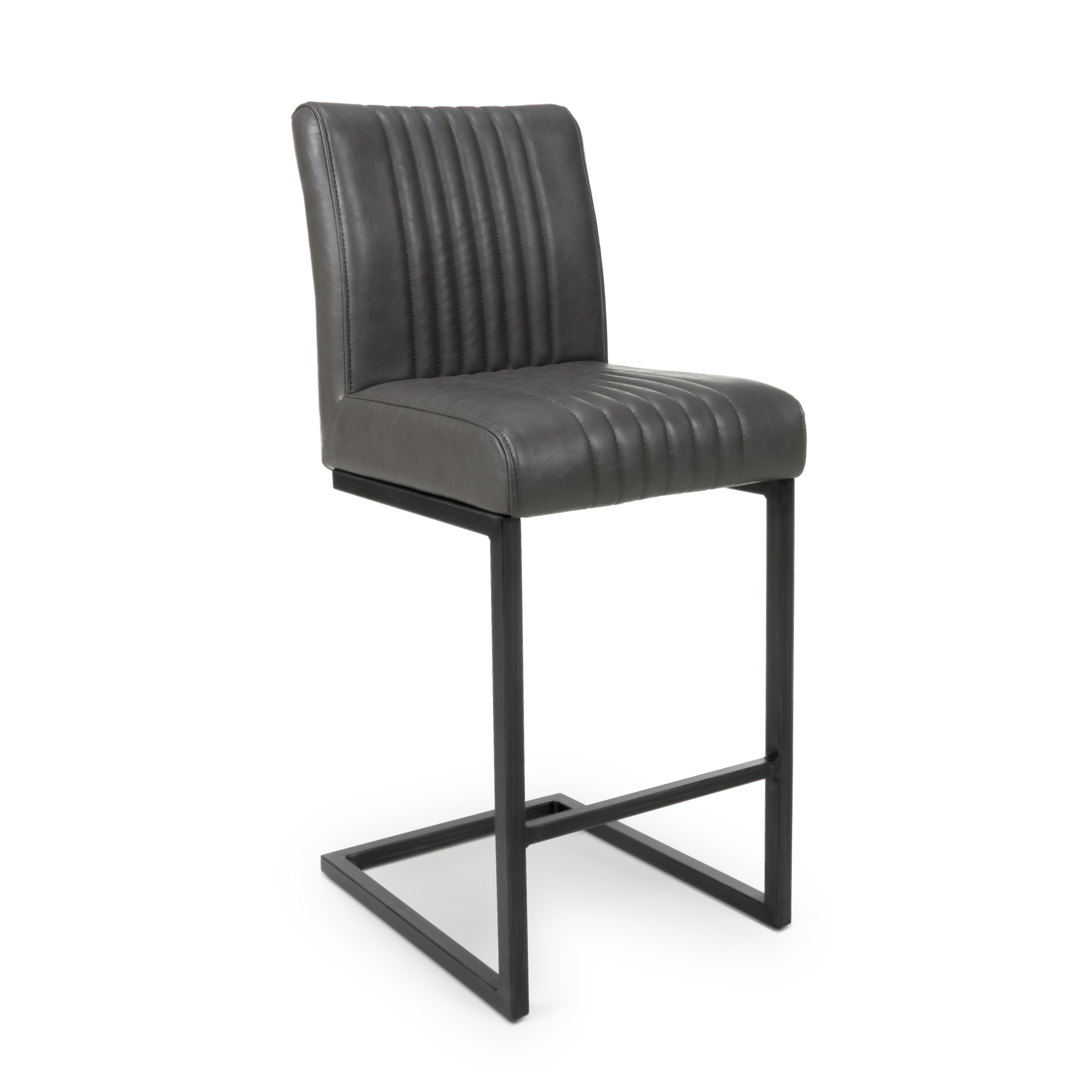 Experience the contemporary appeal of the Shankar Archer Bar Chairs, featuring durable brownish grey leather effect upholstery with vertical center stitching. These chairs bring a touch of sophistication and rugged charm to any bar setting.