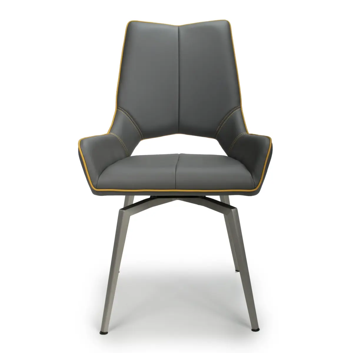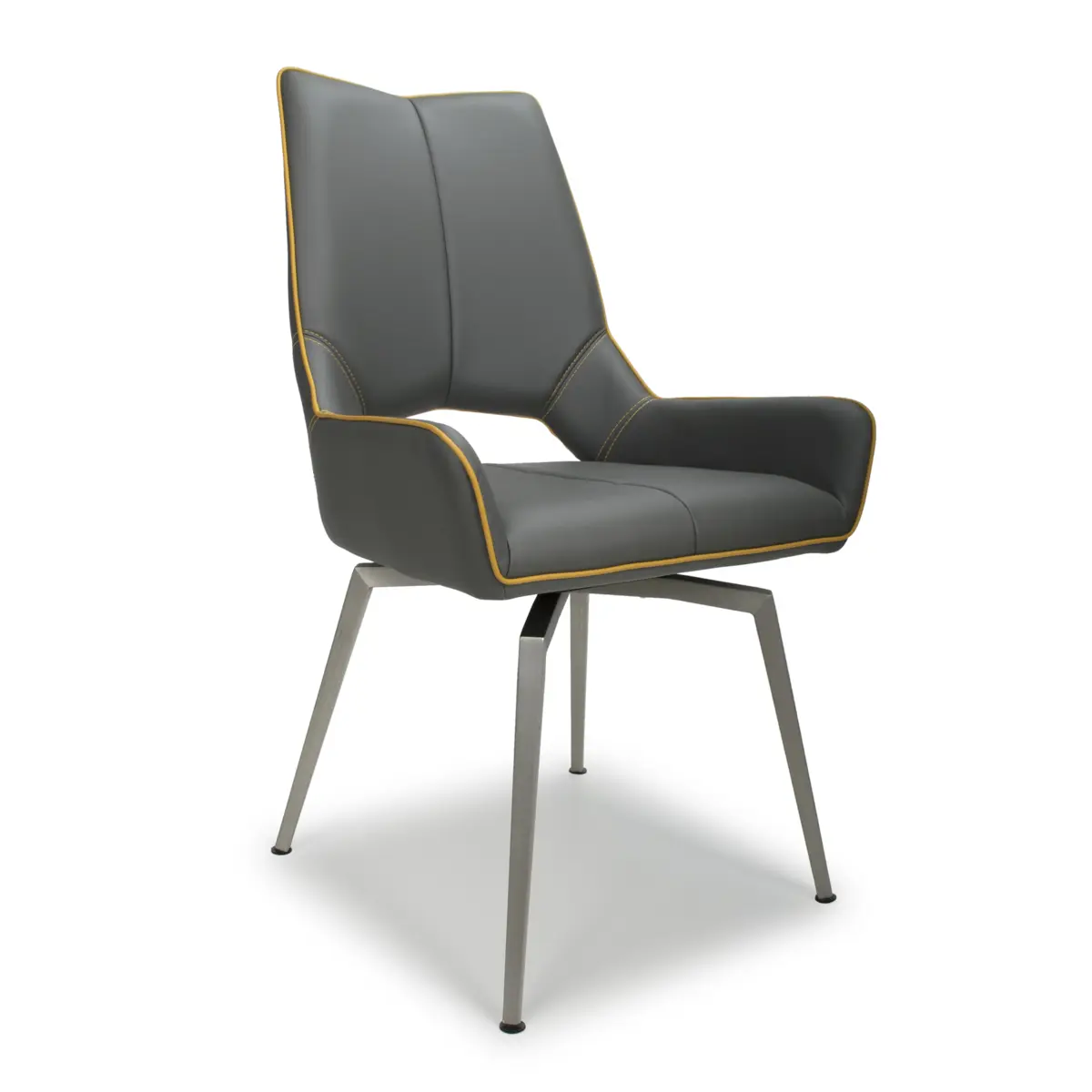 Sold in boxes of 2, the Shankar Mako Swivel Leather Effect Graphite Grey Dining Chairs are the perfect choice for enhancing your dining space with modern flair and functionality.