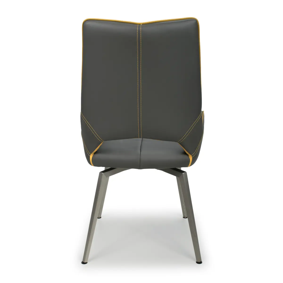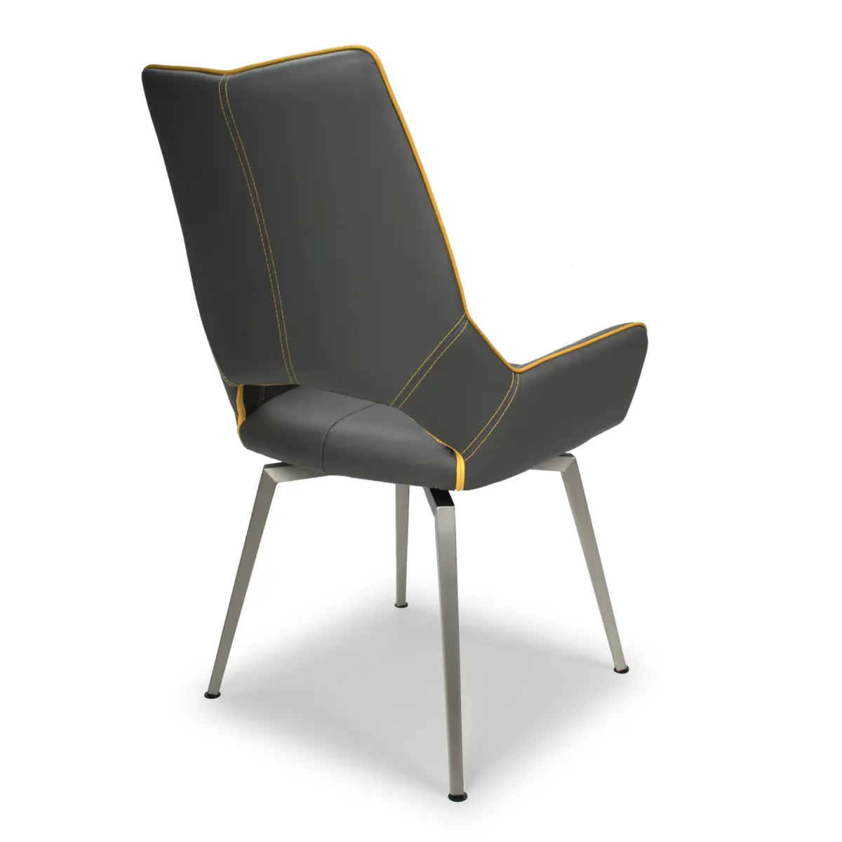 Experience the sleek sophistication of the Shankar Mako Dining Chairs, featuring an ultra-modern angled design upholstered in graphite grey leather effect. The smooth swivel feature allows for easy movement, effortlessly returning to a central position after use, providing both comfort and convenience.