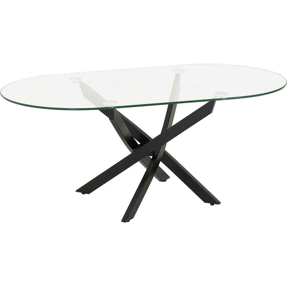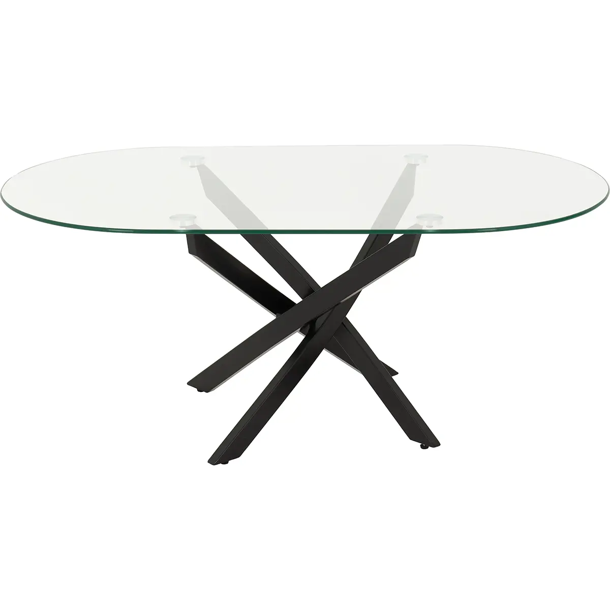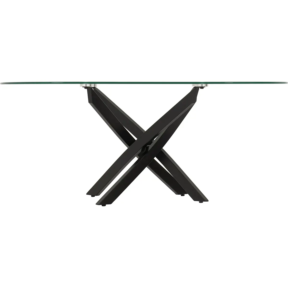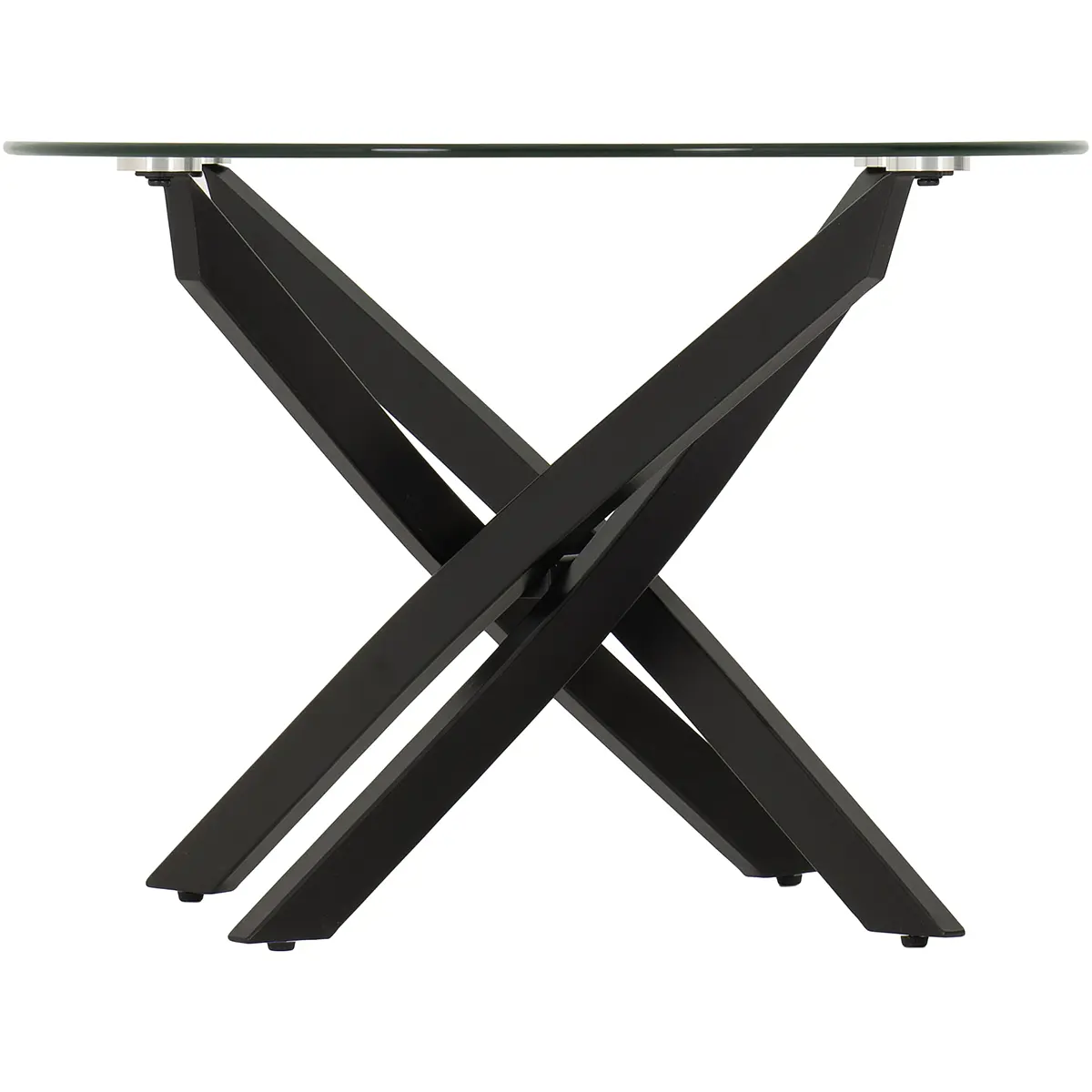 Modern Design: A sleek blend of clear tempered glass and bold black metal creates a contemporary, eye-catching statement. Unique Base Structure: Intersecting metal legs form a sculptural criss-cross design for added visual interest and stability. Tempered Glass Top: Strong and durable, the clear glass surface offers a clean, minimalist look that complements any décor. Coordinating Range Available: Complete the look with matching items from the same collection.