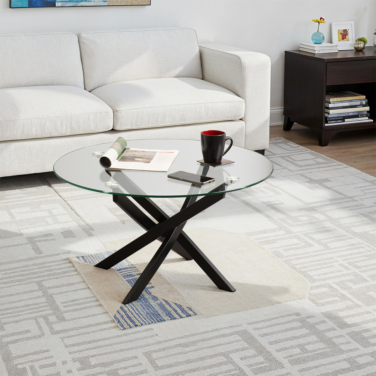 Add a sleek, sculptural statement to your living space with this modern round top coffee table, designed to blend contemporary style with everyday practicality. The clear tempered glass top offers a spacious surface while keeping the room feeling open and light, supported by a striking black criss-cross base that adds bold architectural flair. Perfect for modern homes, this piece arrives flat packed for easy self-assembly and is ideal for those looking to update their living area with minimal fuss and maximum impact. Pair it with other coordinating items from the same collection to create a cohesive, on-trend look throughout your home.