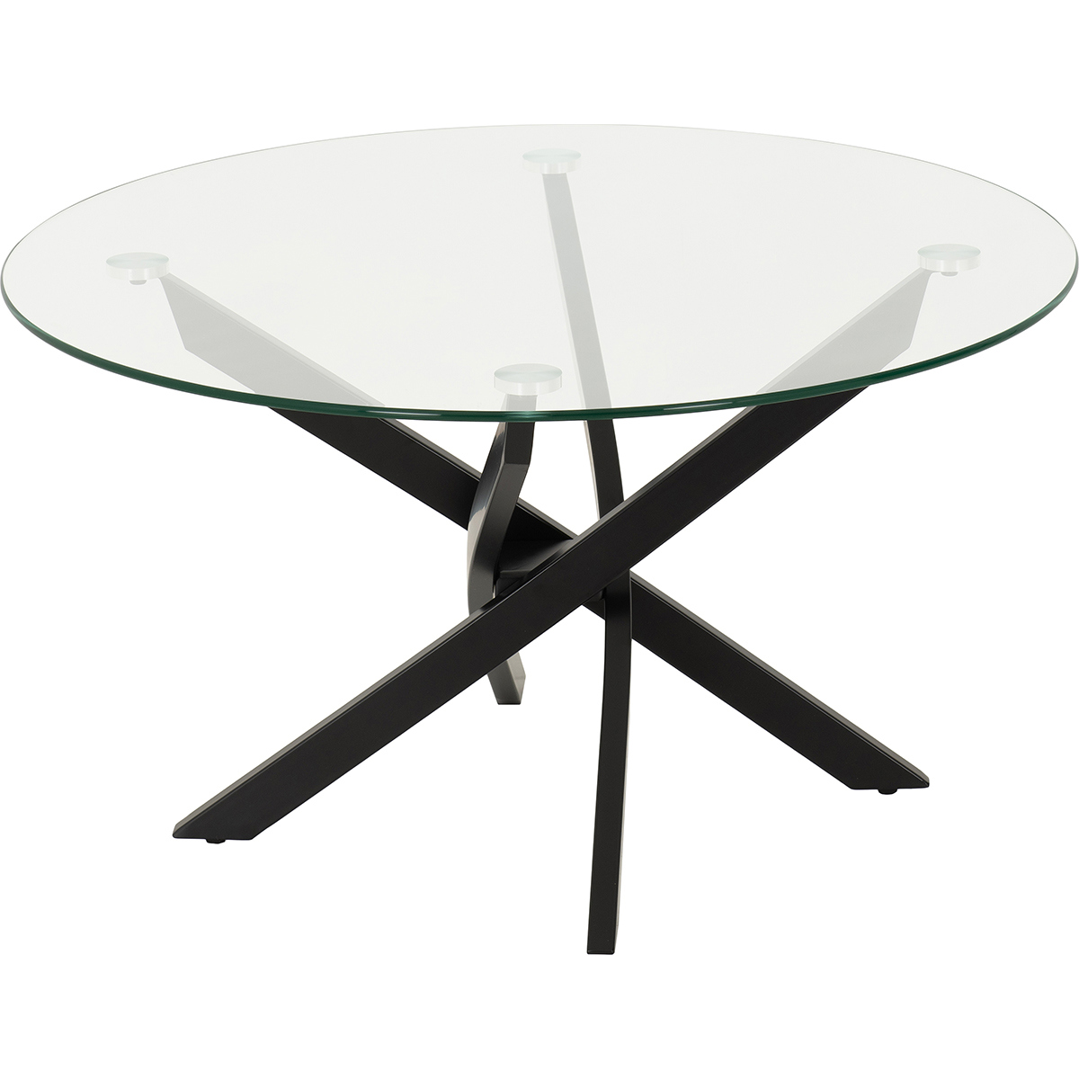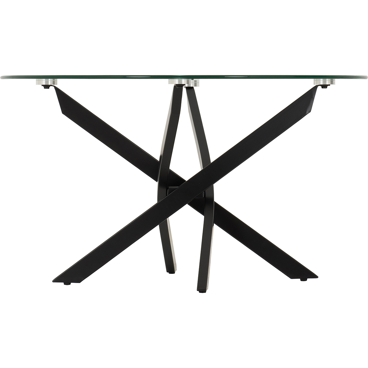 Modern Design: A sleek blend of clear tempered glass and bold black metal creates a contemporary, eye-catching statement. Unique Base Structure: Intersecting metal legs form a sculptural criss-cross design for added visual interest and stability. Tempered Glass Top: Strong and durable, the clear glass surface offers a clean, minimalist look that complements any décor. Coordinating Range Available: Complete the look with matching items from the same collection.