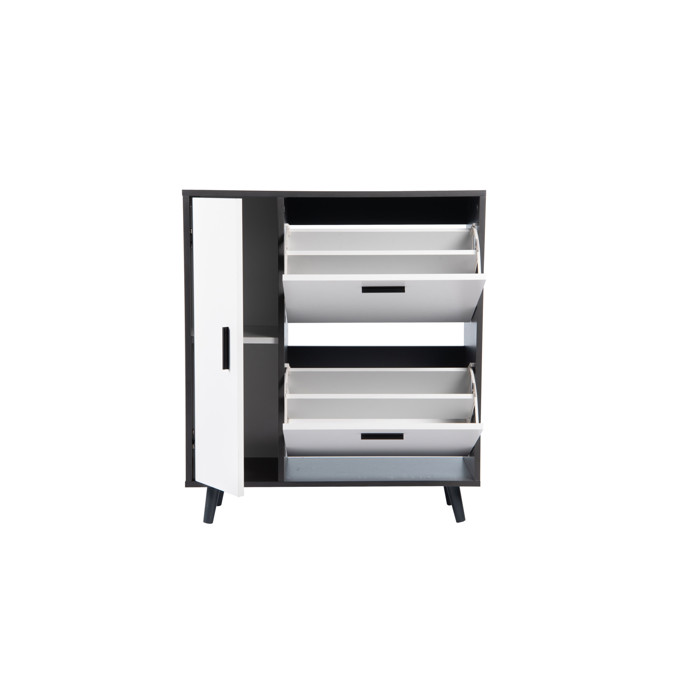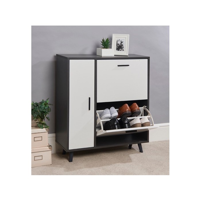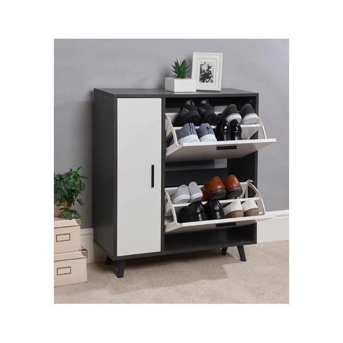 Looking for a nifty place to store your footwear? This compact shoe storage cabinet provides the ultimate way to make your home look tidy whilst keeping your favourite footwear in tip-top condition. Inside the pull-down drawers are two sturdy shelves designed to hold a minimum of 10 pairs of shoes depending on the size. A vertical cupboard with an extra shelf provides yet more storage for larger footwear such as boots or wellies, or an ideal place for grab-and-go essentials. Consider this the must-have furniture piece you never knew you needed. Easy home assembly.