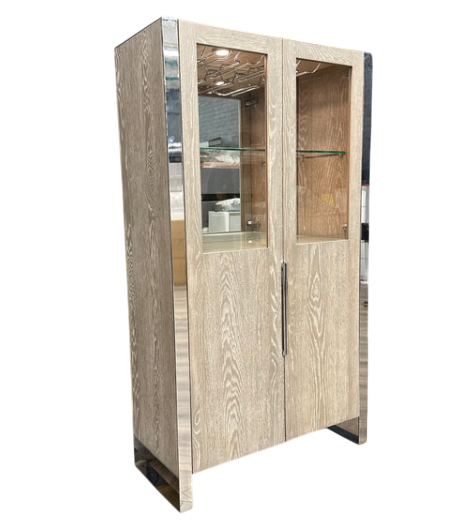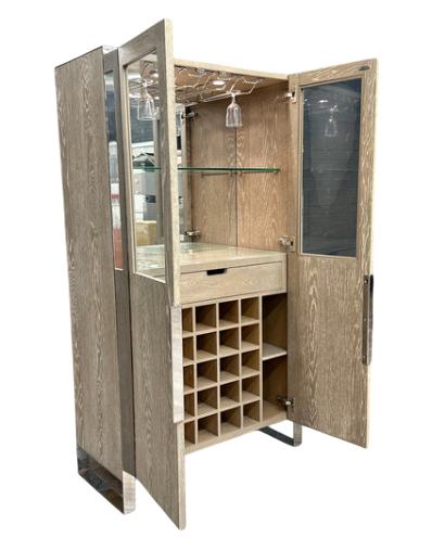 This is a stylish Oak & Chrome drinks cabinet with a contemporary design, featuring a light wood finish. The cabinet includes the following features:
