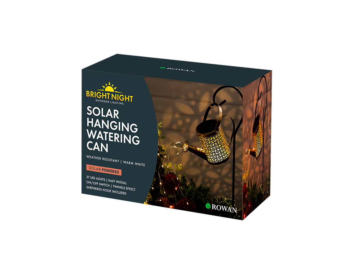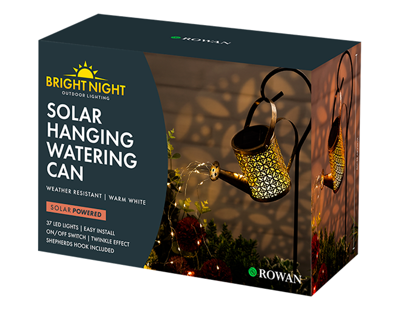 • Decorative solar-powered hanging watering can light