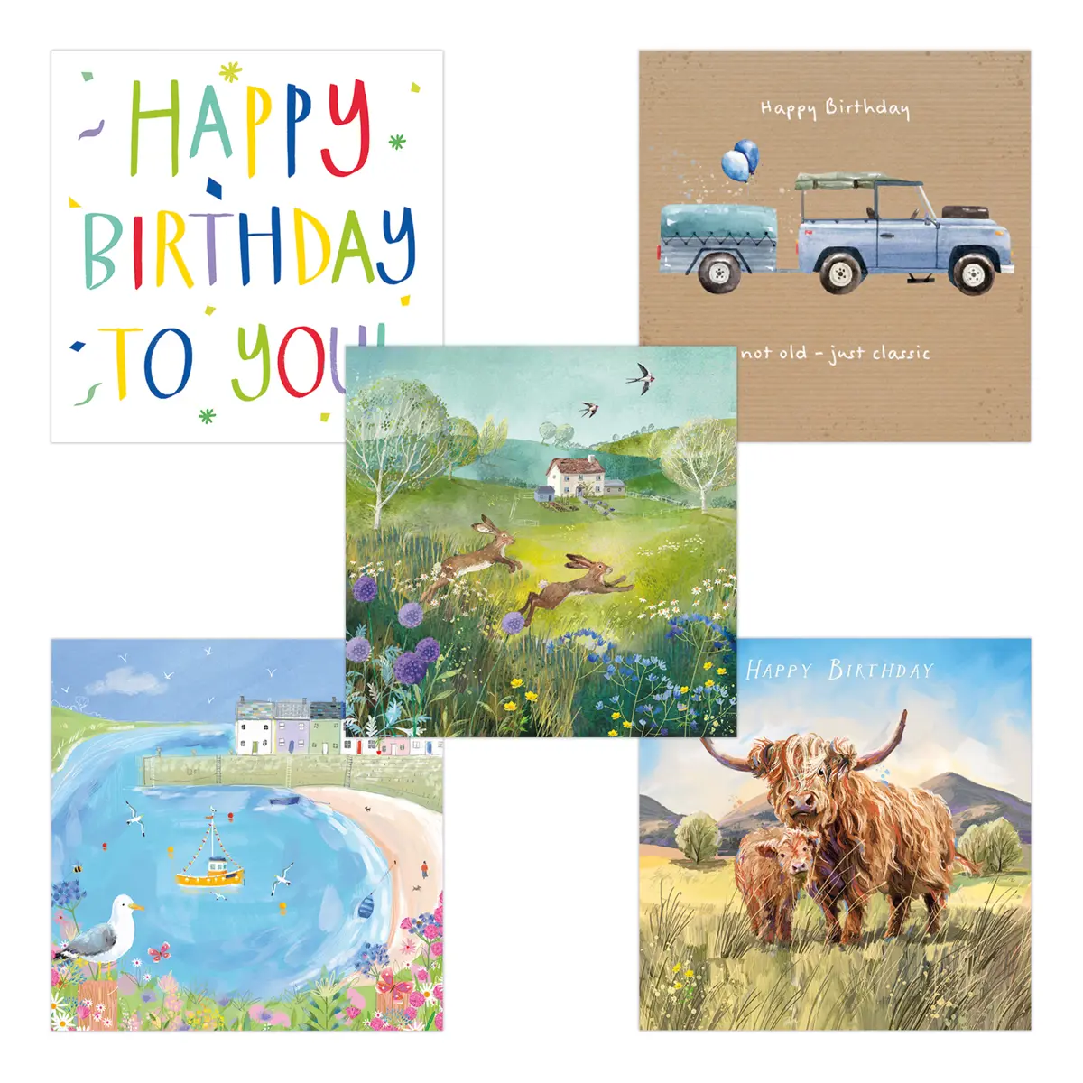 Send birthday wishes with this pack of 5 charity birthday cards. Printed in the UK using vegan inks on responsibly sourced paper, these cards are plastic-free and recyclable.