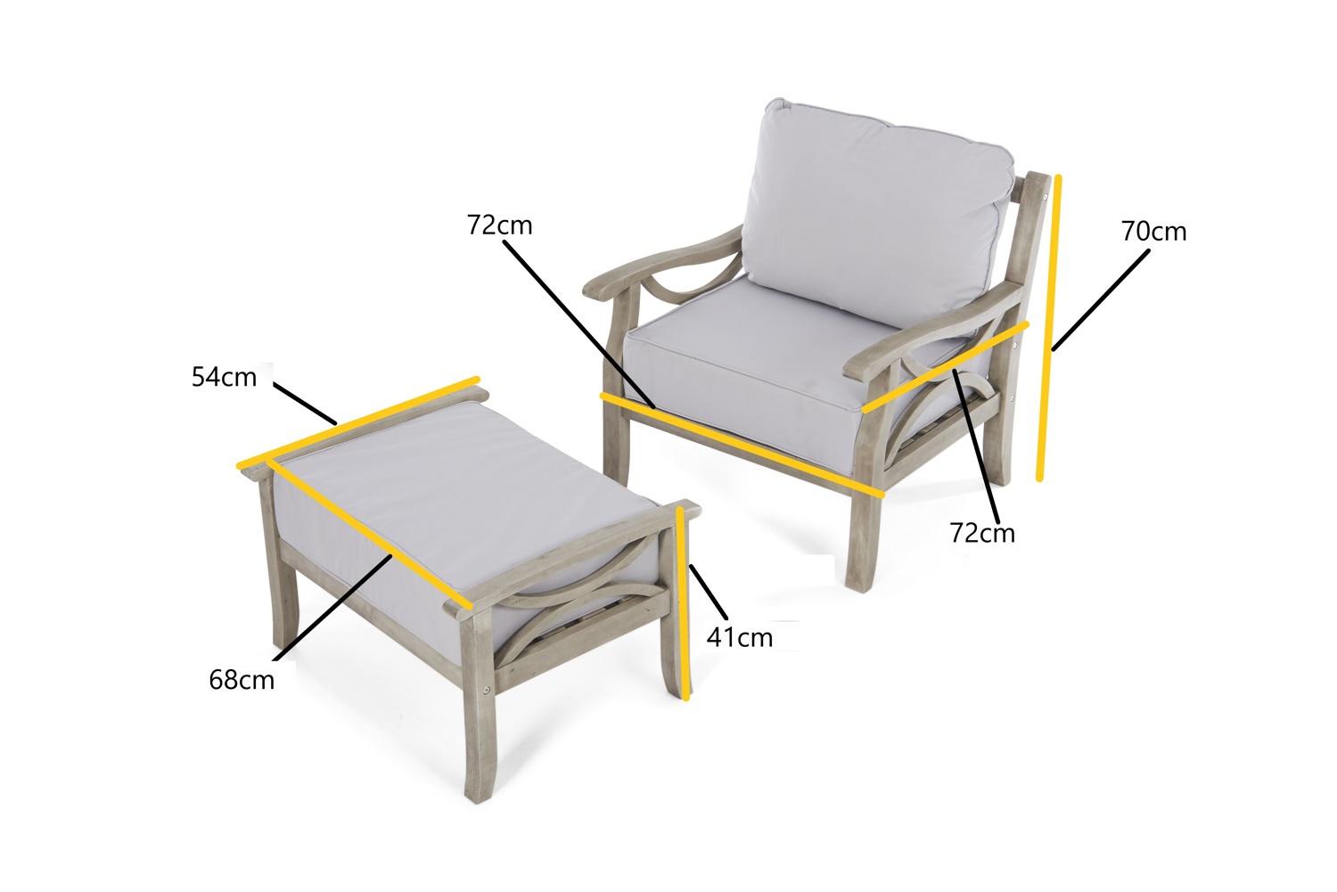 Bring a touch of sophistication to your garden with the Greenhurst Sorrento Armchair Set. Beautifully constructed from solid acacia wood, this chair and footstool duo showcases a contemporary design with an attractively curved frame. With generously padded, showerproof cushions, you can lounge for hours on end no matter the season. Consider the Sorrento set ideal for both indoor or outdoor use, boasting style and practicality in one thoughtful design.