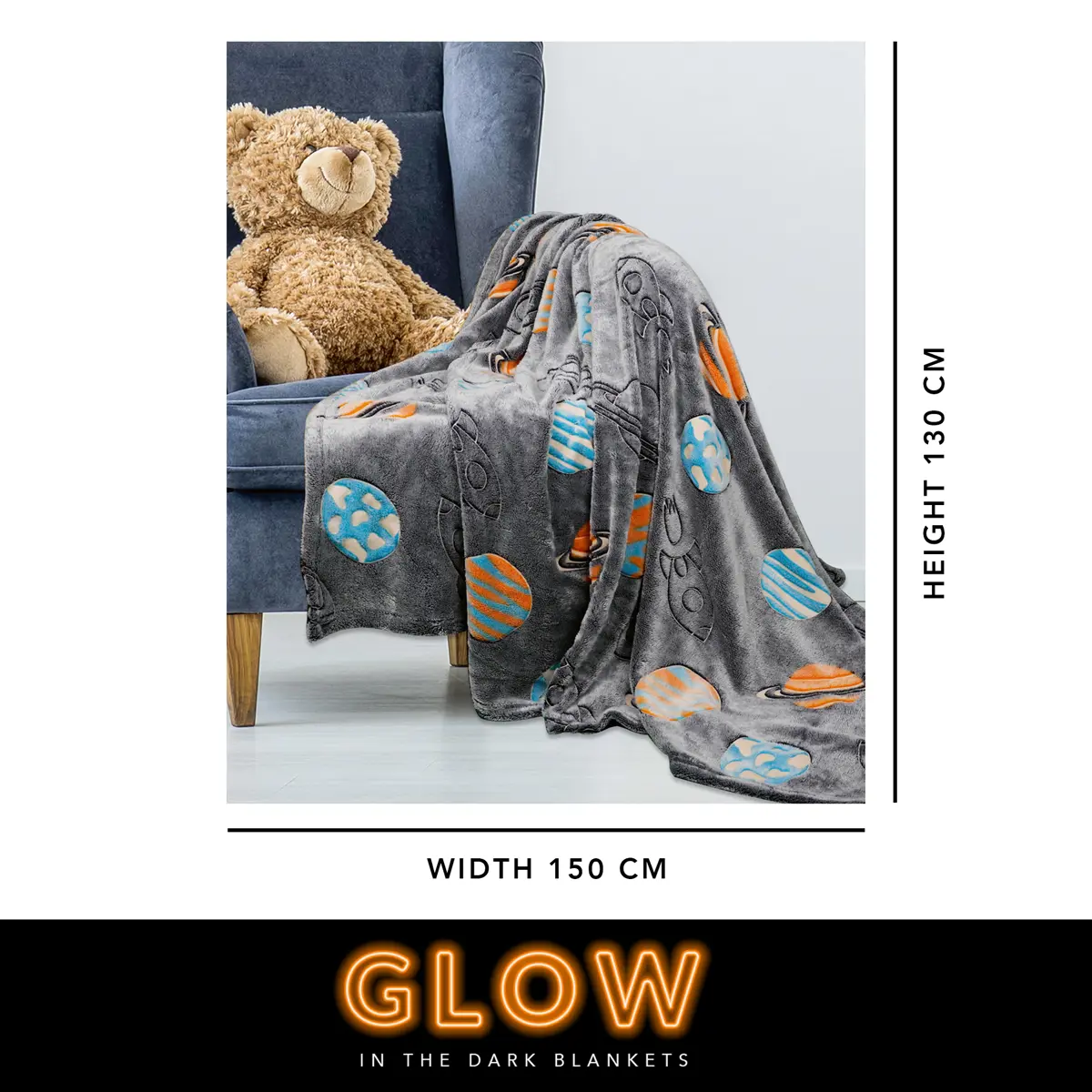Snuggle up with the space print glow-in-the-dark blanket. This ultra-soft and cosy blanket features planet and rocket images that glow in the dark, adding a touch of magic to your child's night time routine. Perfect for bedtime, movie nights on the sofa, or camping trips, this thick and warm blanket ensures ultimate comfort and a peaceful sleep for your little one.
