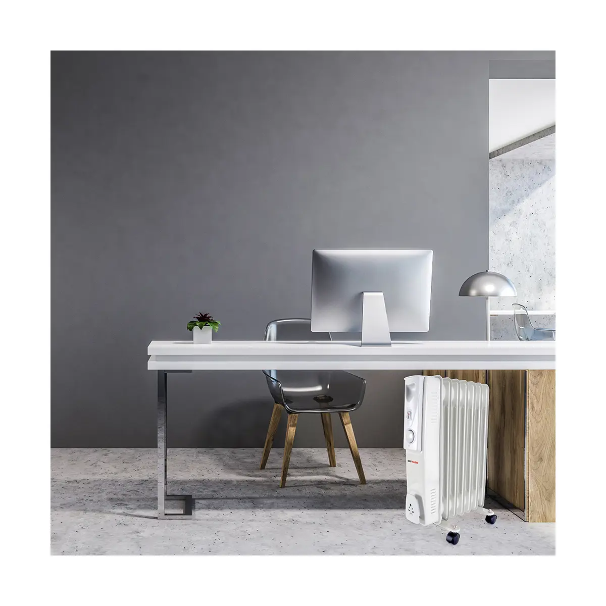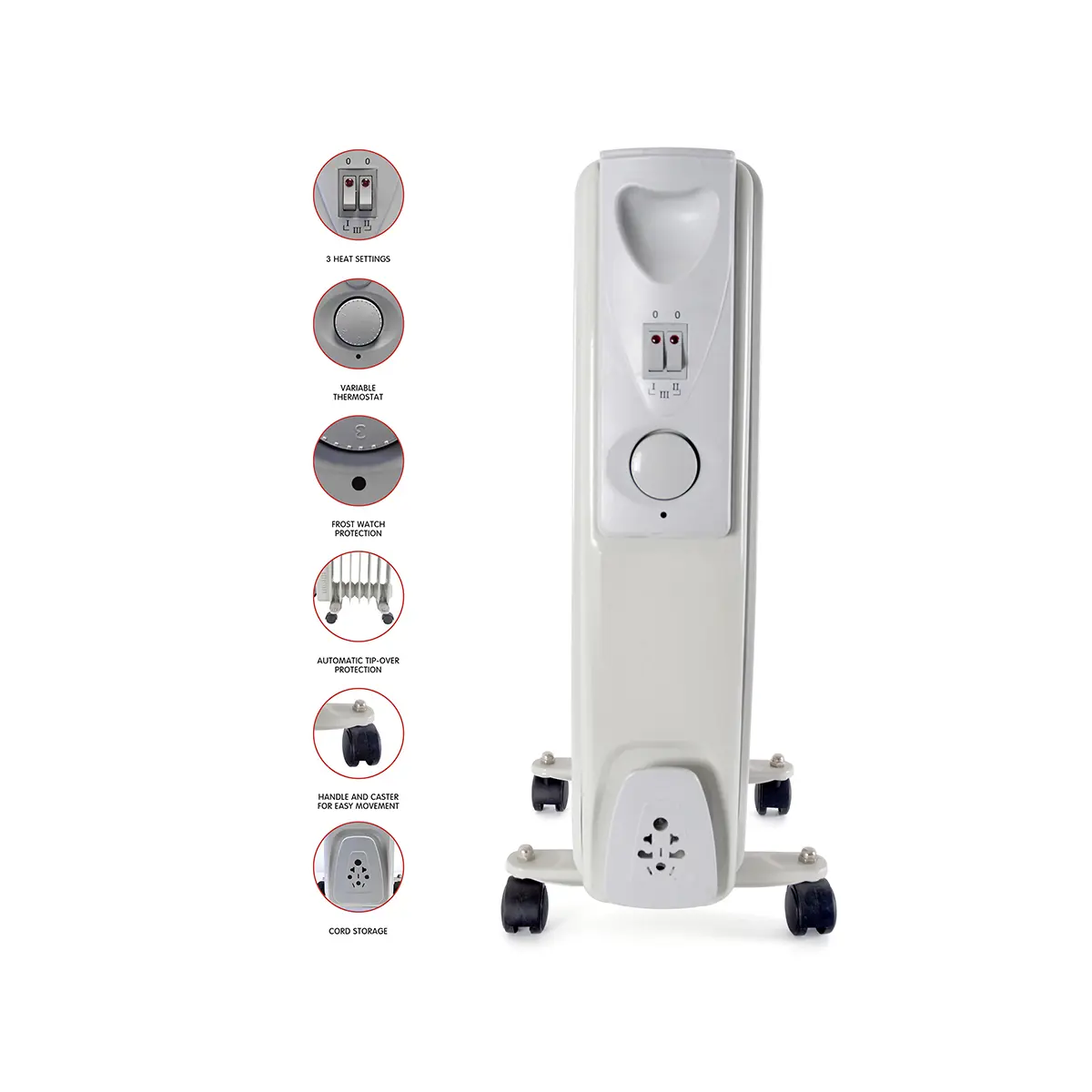Heat your home or office with ease thanks to the StayWarm 7 Fin Oil Radiator. This incredible heater features easy-use dials and buttons whereby you can select the desired heat setting and adjust the variable thermostat. Frost watch protection even means the device automatically turns on to provide heat during low temperatures. Easily transport it from room to room with castor wheels and a comfortable carry handle and when not in use, wrap the cords to keep them out of sight. A wonderful interior accessory boasting top-class style and function. comes ready to use. Size: H 55 x D 12 x W 33 cm