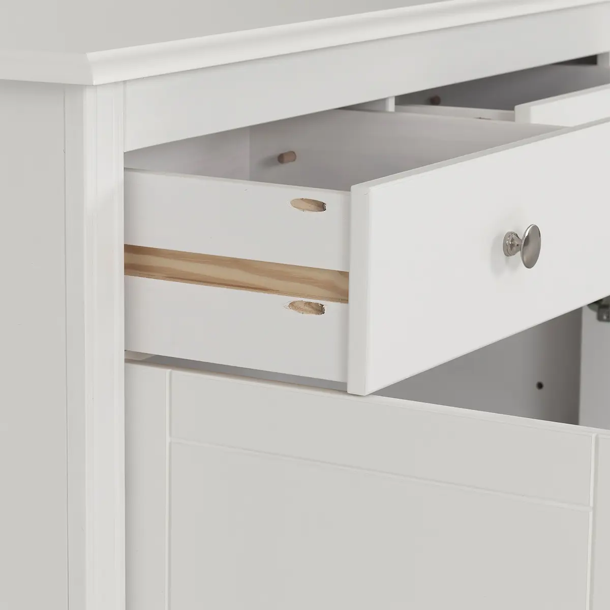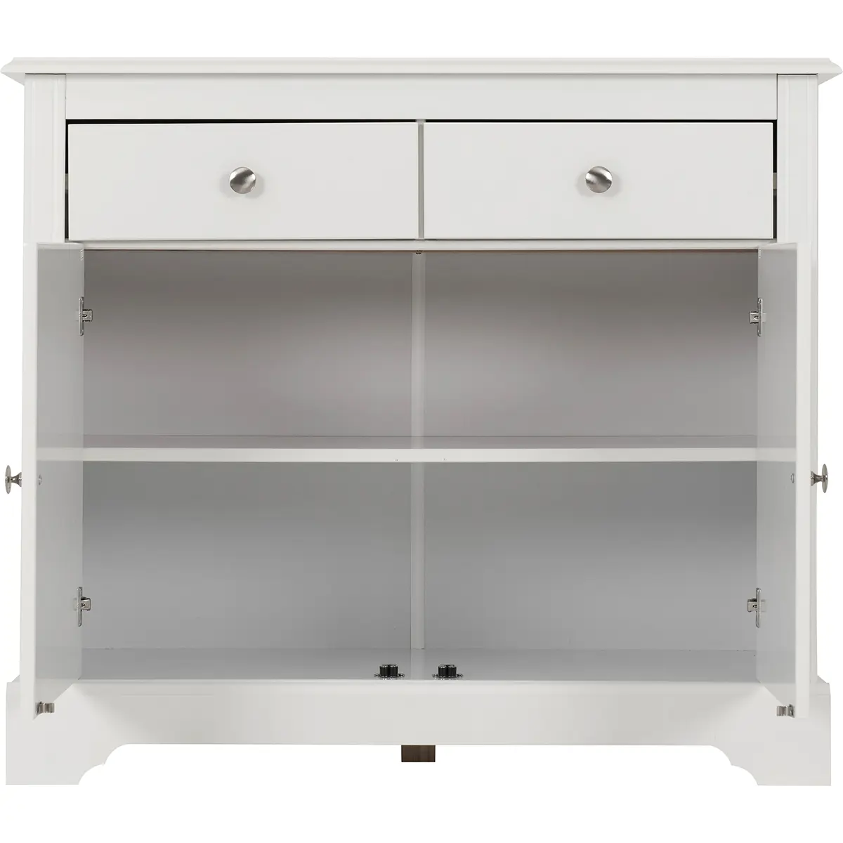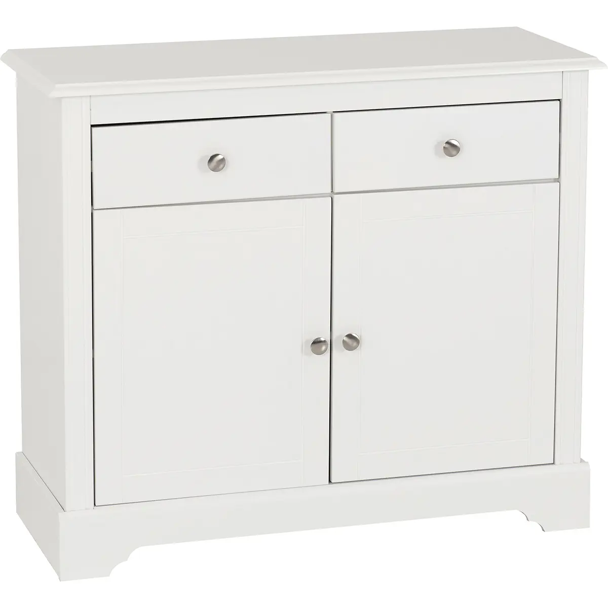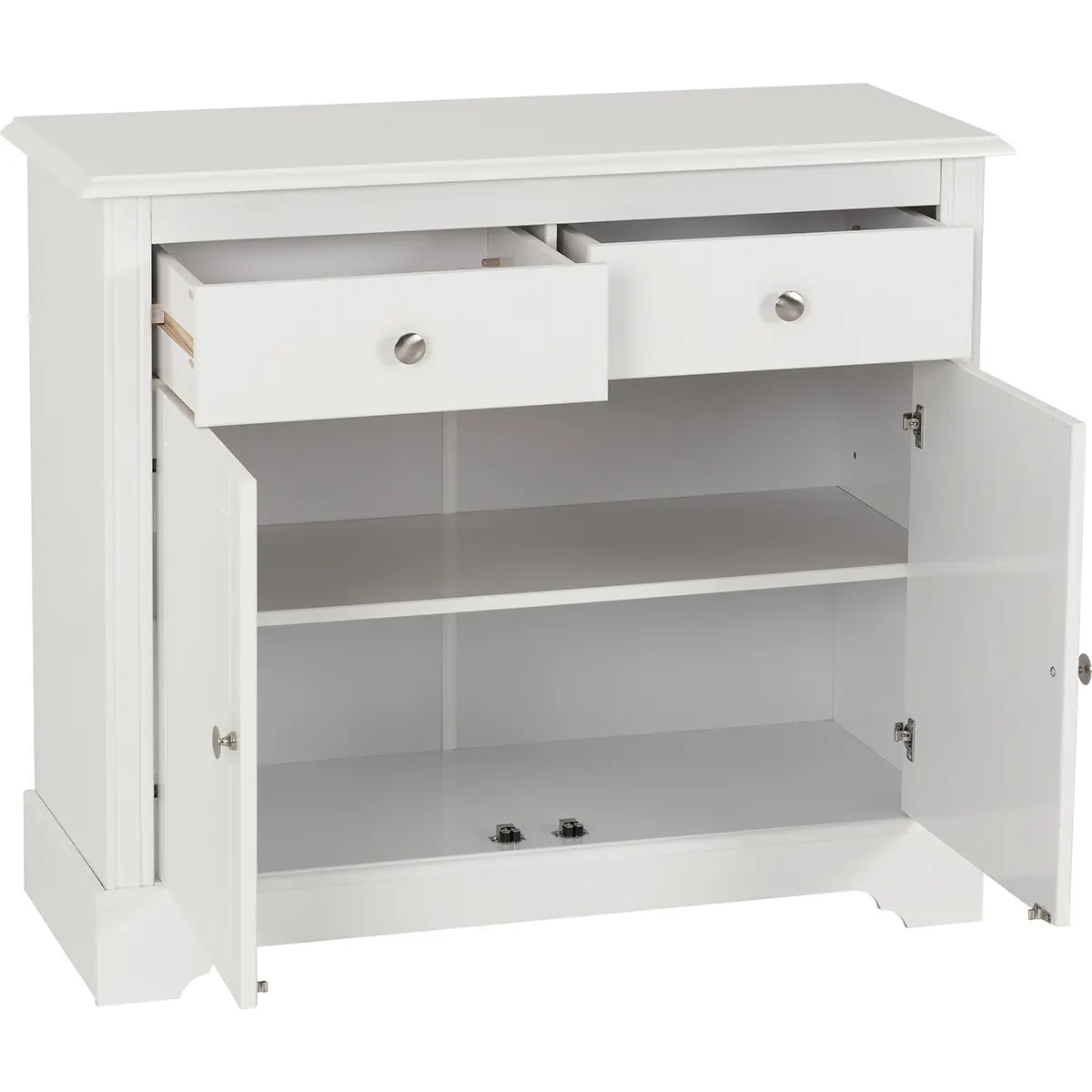 Enhance your living space with this stylish and functional 2 Door 2 Drawer Sideboard in white. This sideboard offers durability and a smooth finish that complements various interior styles. The classic white painted finish provides a clean and contemporary look, perfect for any room in your home. It includes two doors and two drawers, offering ample storage space for your belongings. The doors open to reveal a large compartment with a shelf included, perfect for organizing larger items, while the drawers are ideal for smaller items. Elegant metal round handles add a touch of sophistication to the design. Assembly is convenient with easy home assembly instructions. Suitable for various rooms, including the living room, dining room, or hallway, this sideboard is not only practical but also adds a touch of elegance to your home.