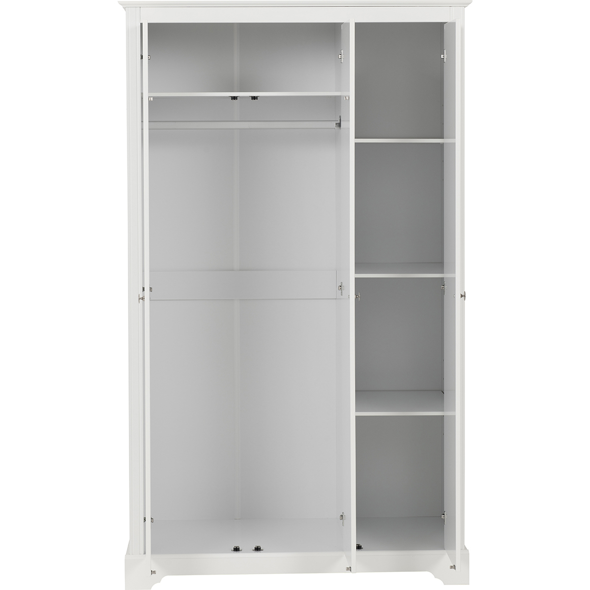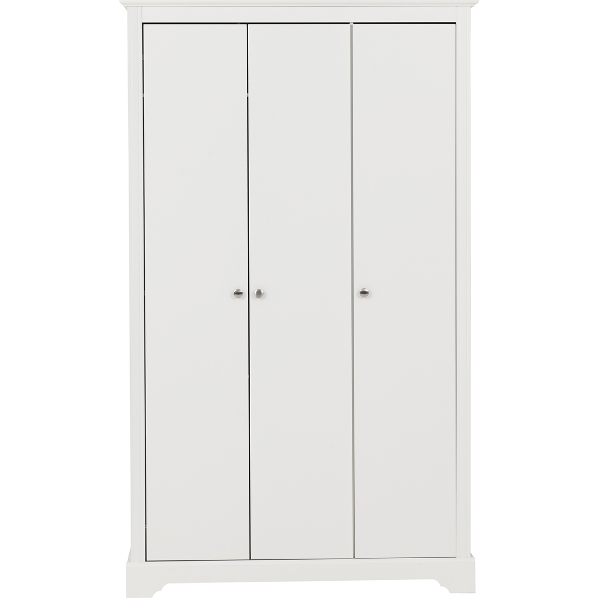Transform your bedroom with this sleek and stylish Modern Elegance Three-Door Wardrobe, featuring a clean and contemporary design finished in a crisp white colour that complements any decor. Enjoy ample storage space with a combination of hanging space and shelving inside, perfect for organizing your clothes and accessories. The small, round metal handles with a polished silver finish add a subtle yet sophisticated contrast to the white exterior, while the flat panel design on the doors enhances the wardrobe’s modern and minimalist aesthetic. A slightly extended top cornice adds a touch of elegance and structure to the overall design, and the gently curved base provides a refined and balanced appearance. The versatile matte white finish blends seamlessly with various bedroom colour schemes and furniture styles, and the sturdy construction ensures stability and durability. Combining style and practicality, this Modern Elegance Three-Door Wardrobe is the perfect addition to any bedroom, offering a timeless design and ample storage space. Upgrade your bedroom today with this elegant and functional piece!