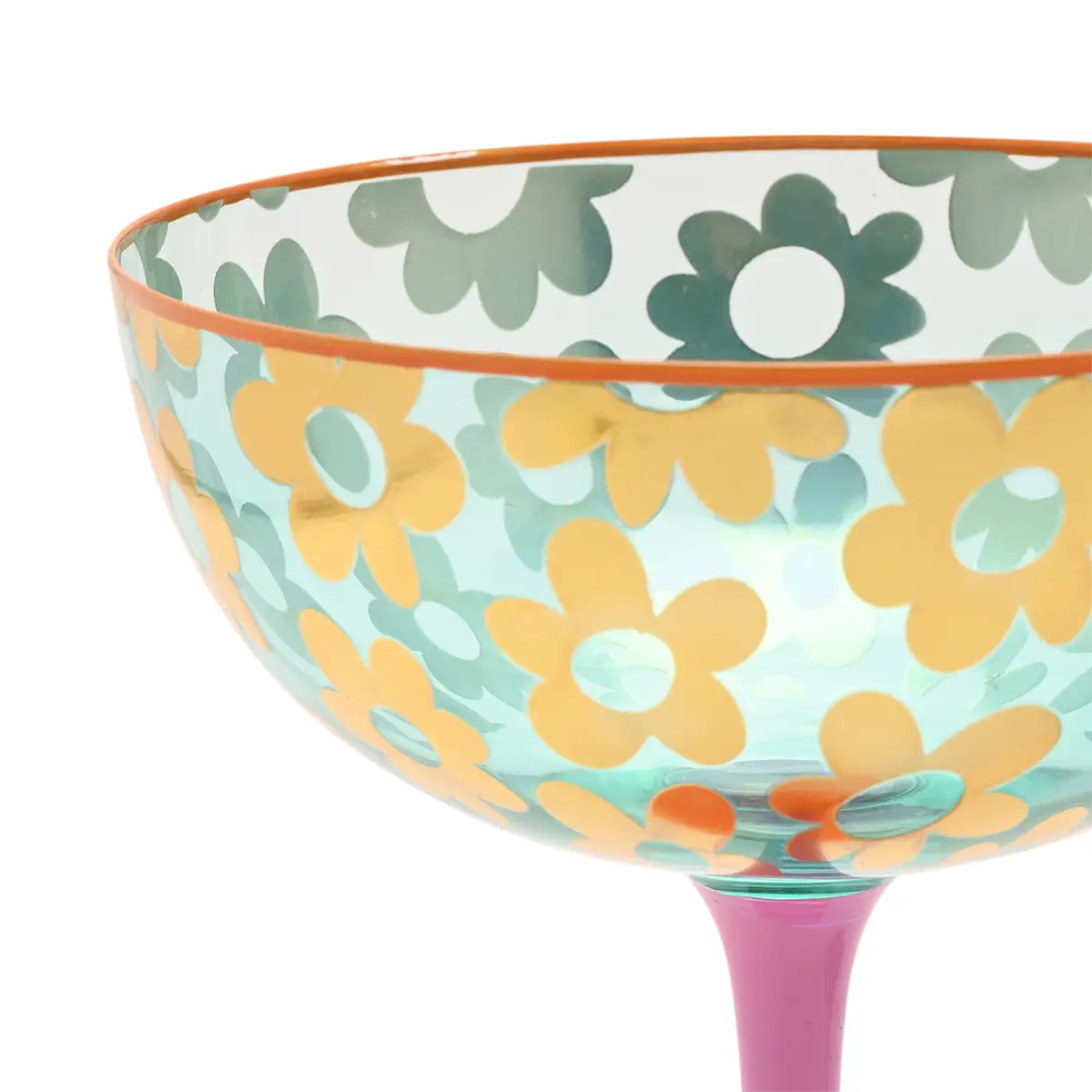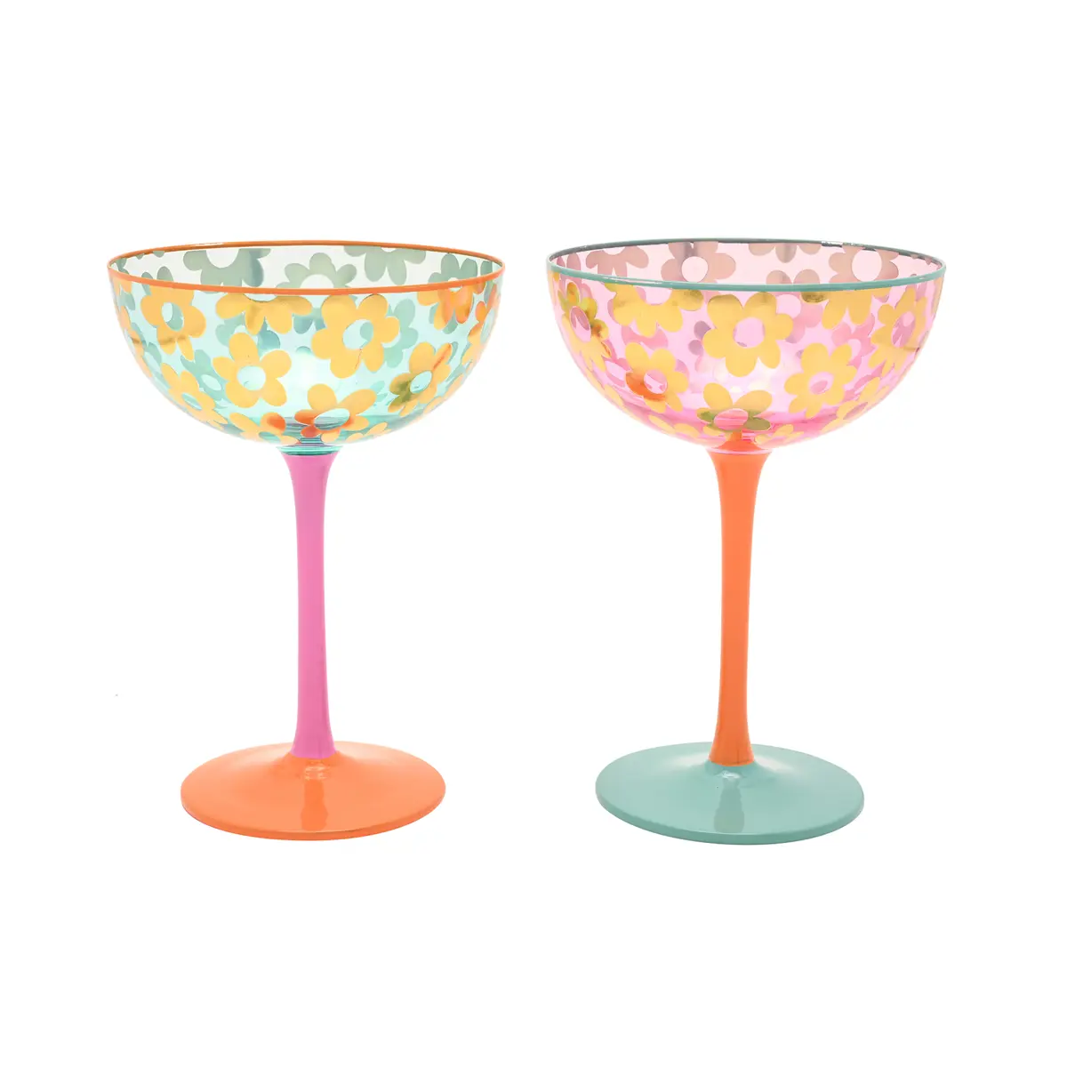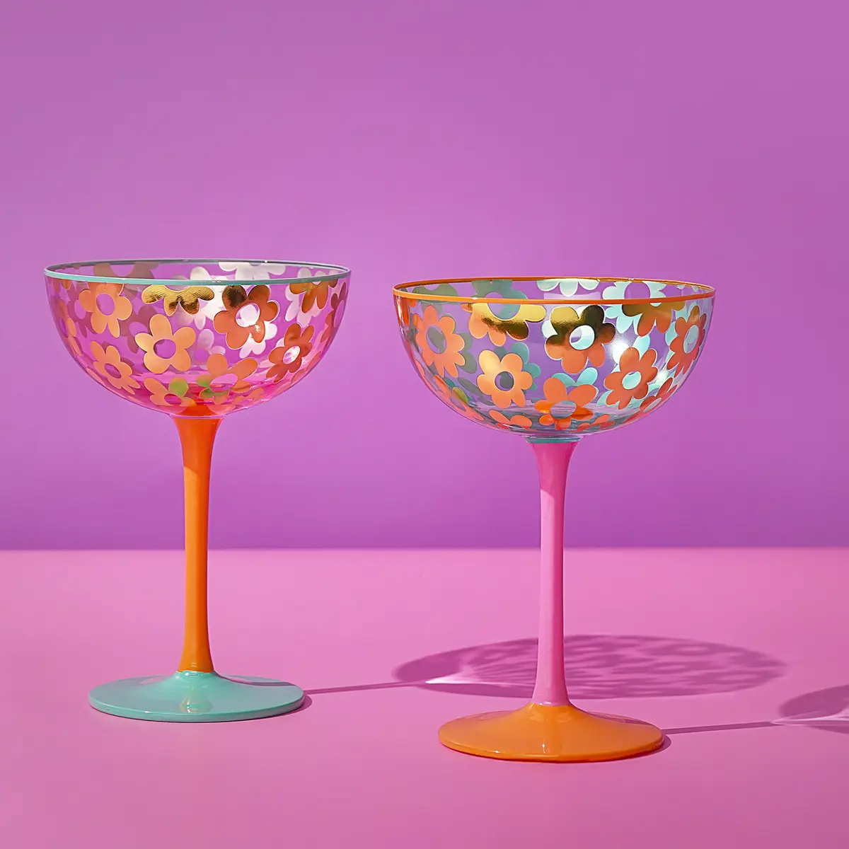 Each coupe glass features vibrant floral patterns that blend playful design with timeless sophistication. Beautifully presented in gift ready packaging, this set is perfect for thoughtful gifting or elevating your own entertaining at home.