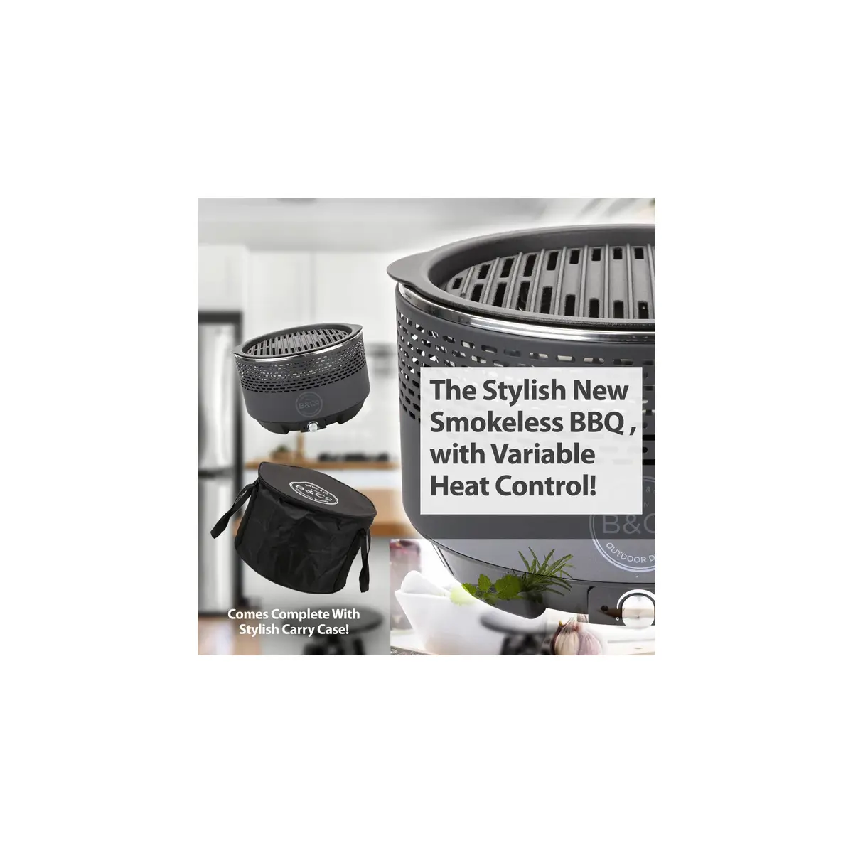 Experience the next evolution in outdoor cooking with the B&Co Smokeless Alfresco Grill—a smarter, cleaner, faster way to enjoy authentic charcoal-grilled flavour. Designed for effortless alfresco dining, this innovative grill is ready to cook in under five minutes and produces minimal smoke, making it perfect for gardens, parks, campsites, and caravans.