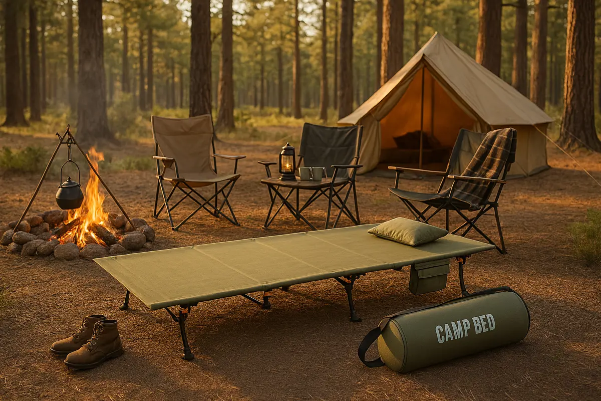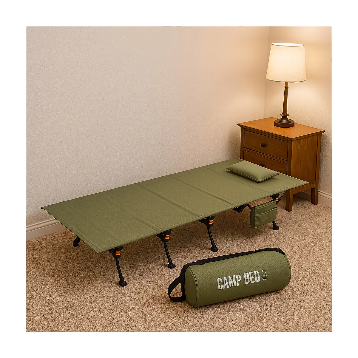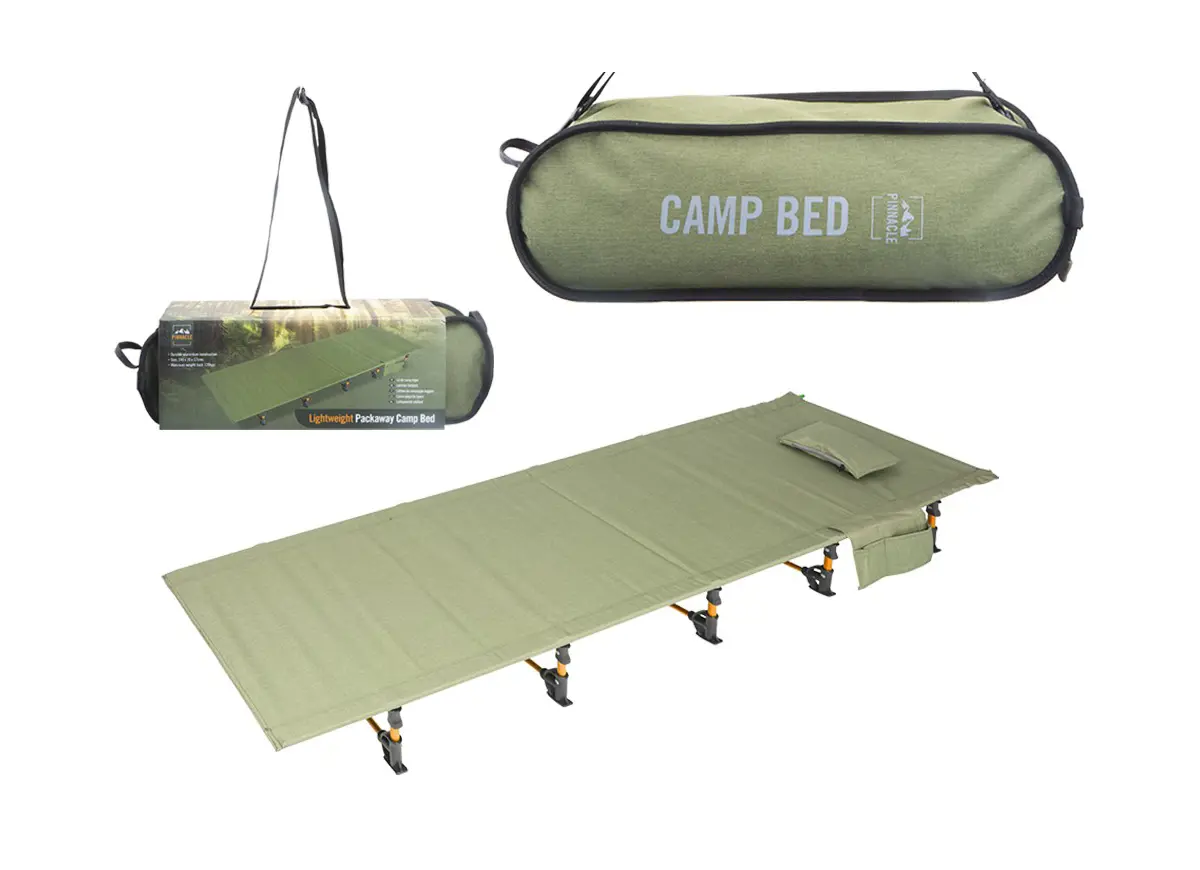 The compact folding design allows the bed to be set up in moments and packed neatly into the included carry bag with woven strap and zip. It stores easily in a car boot, tent corner, or at home when not in use.
